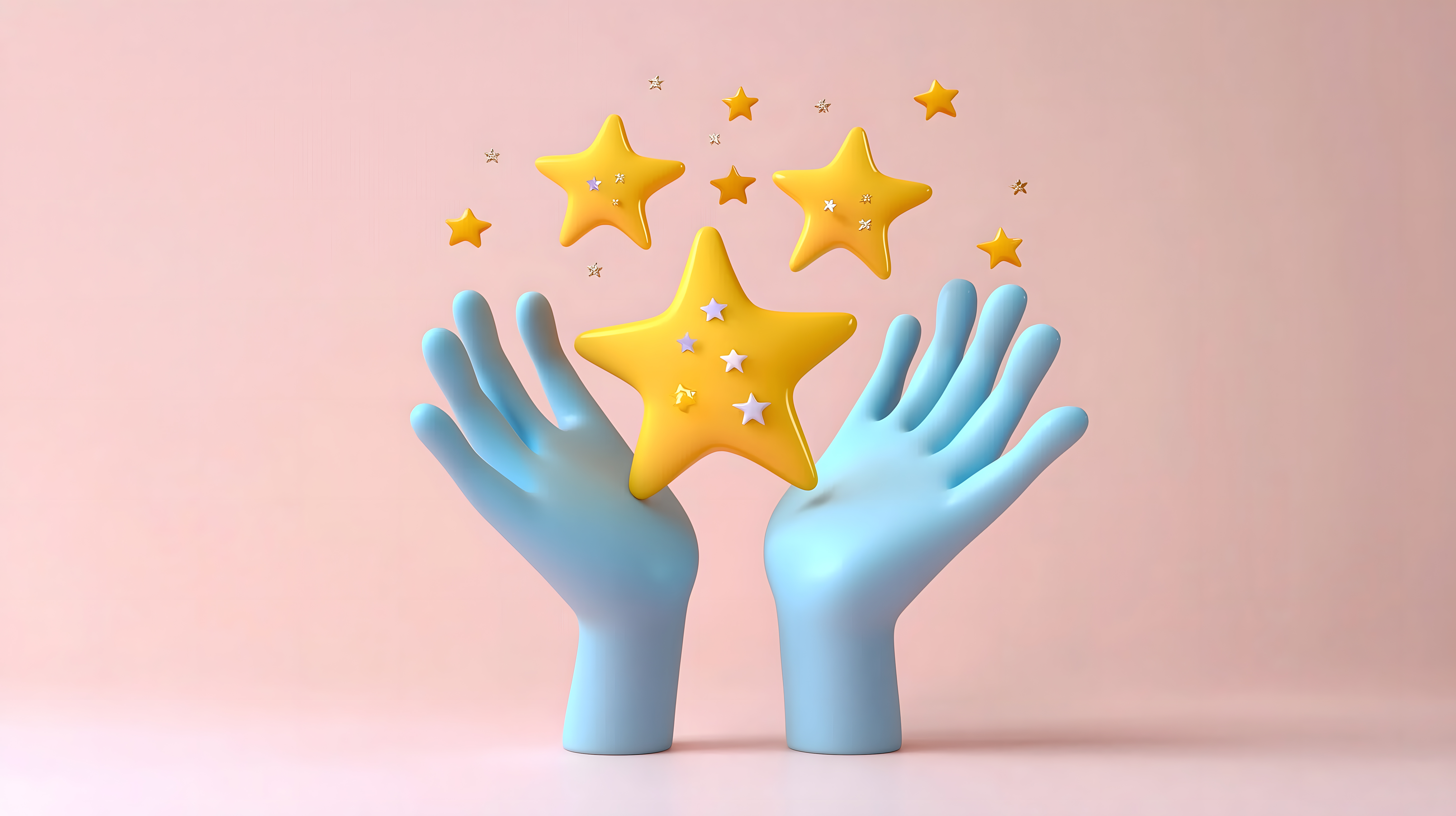 Dieses einzigartige Stockfoto zeigt zwei stilisierte Hände, die strahlende Sterne emporhalten. Die Hände sind in einem sanften Blau gehalten, während die Sterne in kräftigem Gelb leuchten. Diese symbolhafte Darstellung vermittelt Erfolg, Qualität und positive Bewertung. Die minimalistisch-abstrakte Gestaltung verleiht dem Bild eine moderne, ästhetische Ausstrahlung.
