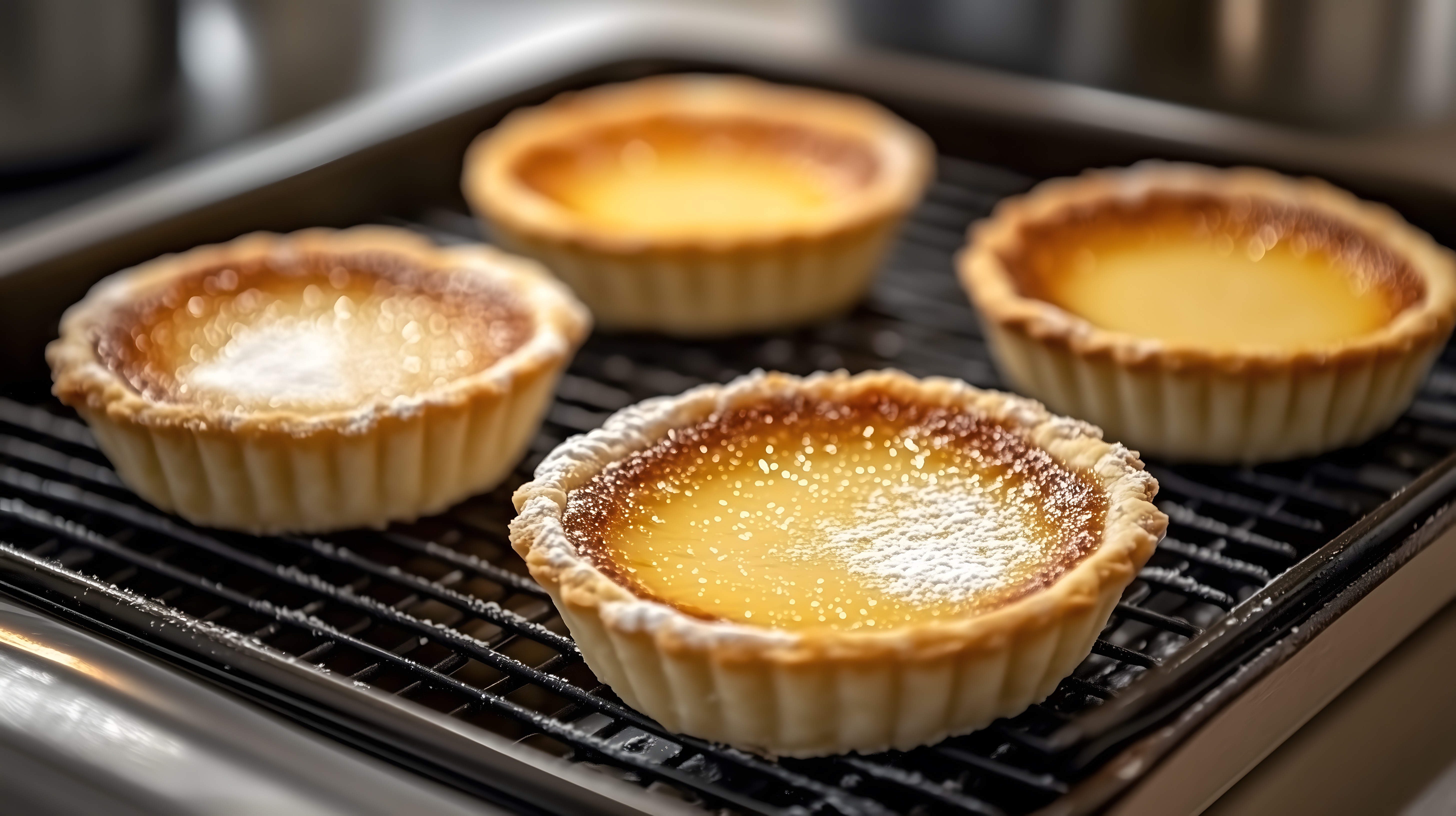 Das Bild zeigt eine Nahaufnahme von frisch gebackenen Zitronentörtchen, die auf einem Rost im Backofen liegen. Die Törtchen haben eine goldbraune, knusprige Oberfläche und sind mit einem feinen Zuckerguss bedeckt, der in der Sonne glänzt. Die Perspektive hebt die appetitlichen Details der Backwaren hervor und erzeugt eine einladende, gemütliche Atmosphäre. Dieses hochwertige Stockfoto eignet sich hervorragend für den Einsatz in Blogs, Newslettern, Social-Media-Beiträgen oder Werbekampagnen rund um das Thema Backwaren, Desserts und Konditorei. Das Bild ist in hoher Auflösung verfügbar und kann unter den Bedingungen der Creative-Commons-Lizenz kostenfrei verwendet werden.