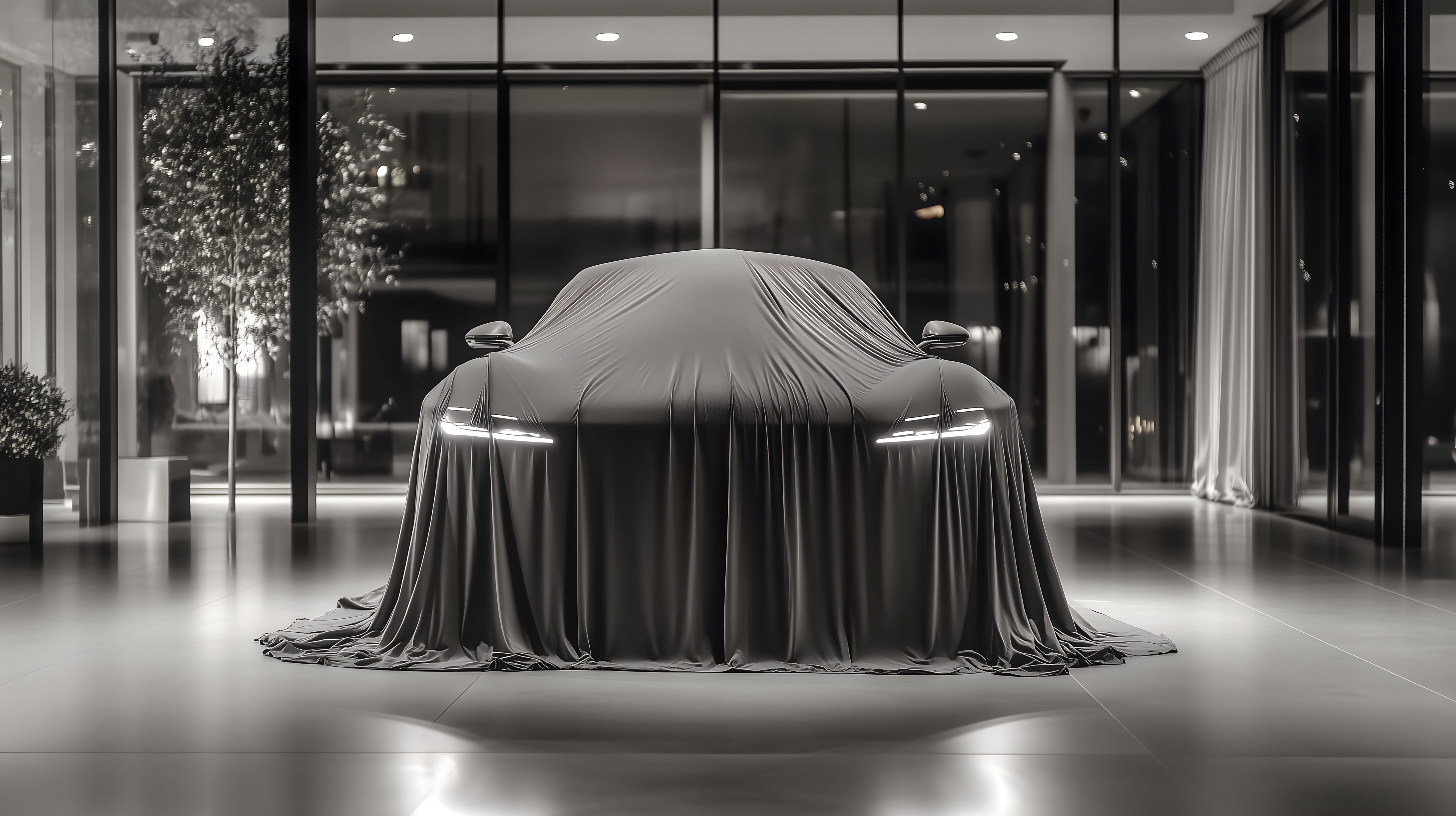 Das Bild zeigt einen modernen Ausstellungsraum mit einer Glasfassade, in dem ein luxuriöses Auto unter einer Abdeckung platziert ist. Der Raum ist in Schwarz-Weiß-Tönen gehalten und vermittelt ein elegantes, minimalistisches Design. Das Auto nimmt den Mittelpunkt des Bildes ein und ist in einen drapierenden Stoff gehüllt, der die Spannung und Erwartungshaltung steigert. Dieses Stockfoto eignet sich hervorragend für die Verwendung in Werbematerialien, Blogbeiträgen oder Social-Media-Kanälen rund um das Thema Automotive, Luxus und Design. Es ist in hoher Auflösung und unter einer Creative-Commons-Lizenz verfügbar.