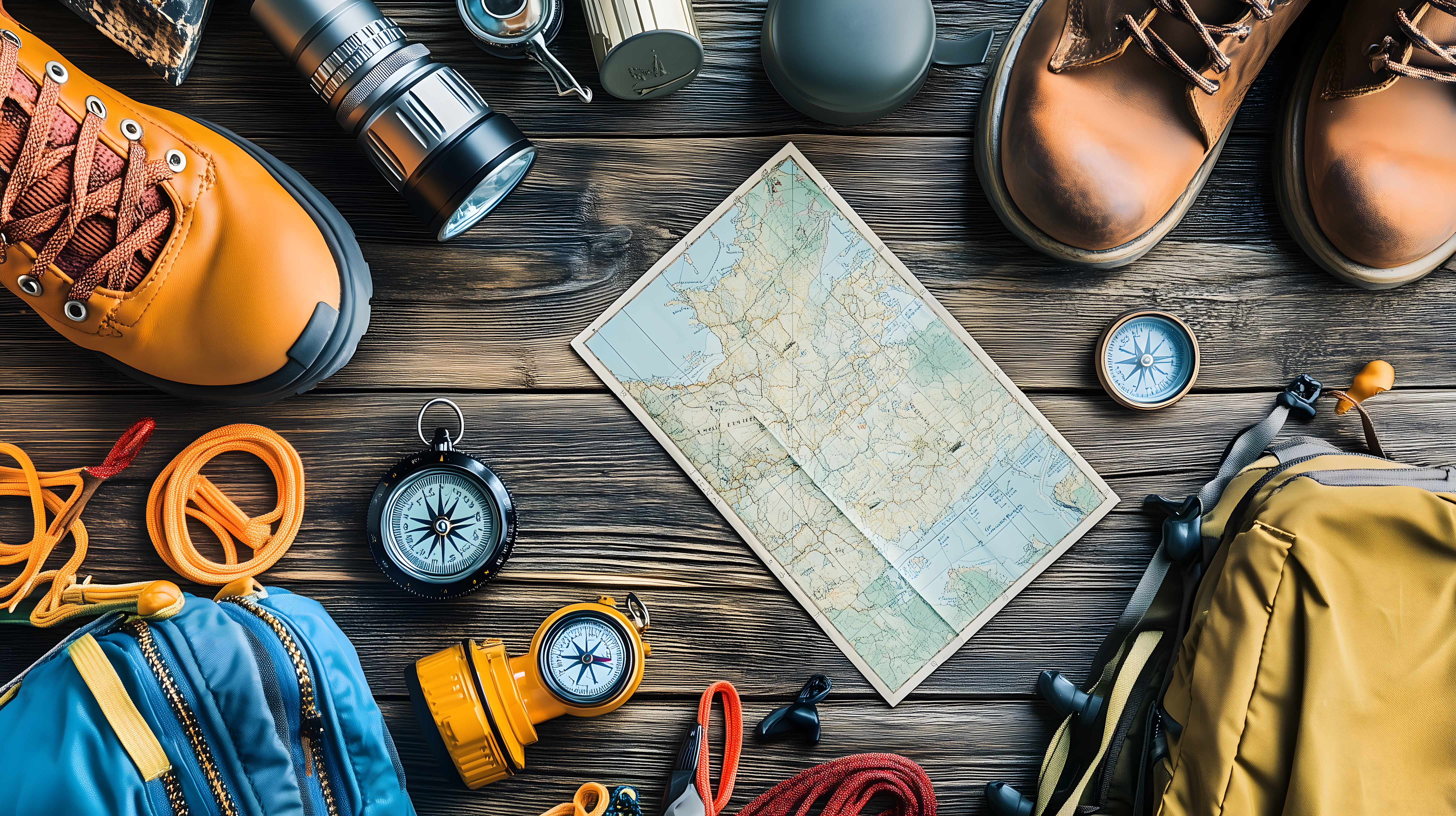 Dieses Foto zeigt eine Auswahl an Outdoor-Ausrüstung, die ideal für Wanderungen und Abenteuer in der Natur geeignet ist. Im Vordergrund sind robuste Wanderstiefel, ein Kompass und eine Landkarte zu sehen, umgeben von einem Rucksack, Seilen und weiteren Accessoires in erdigen Farbtönen. Die Komposition auf dem Holztisch vermittelt einen vintage-inspirierten, authentischen Eindruck, der perfekt für Werbung, Social-Media-Posts oder Newsletter-Designs geeignet ist. Dieses hochauflösende Gratis-Stockfoto unter Creative-Commons-Lizenz bietet viel Potenzial, um Outdoor-Themen in verschiedensten Anwendungskontexten stimmungsvoll in Szene zu setzen.