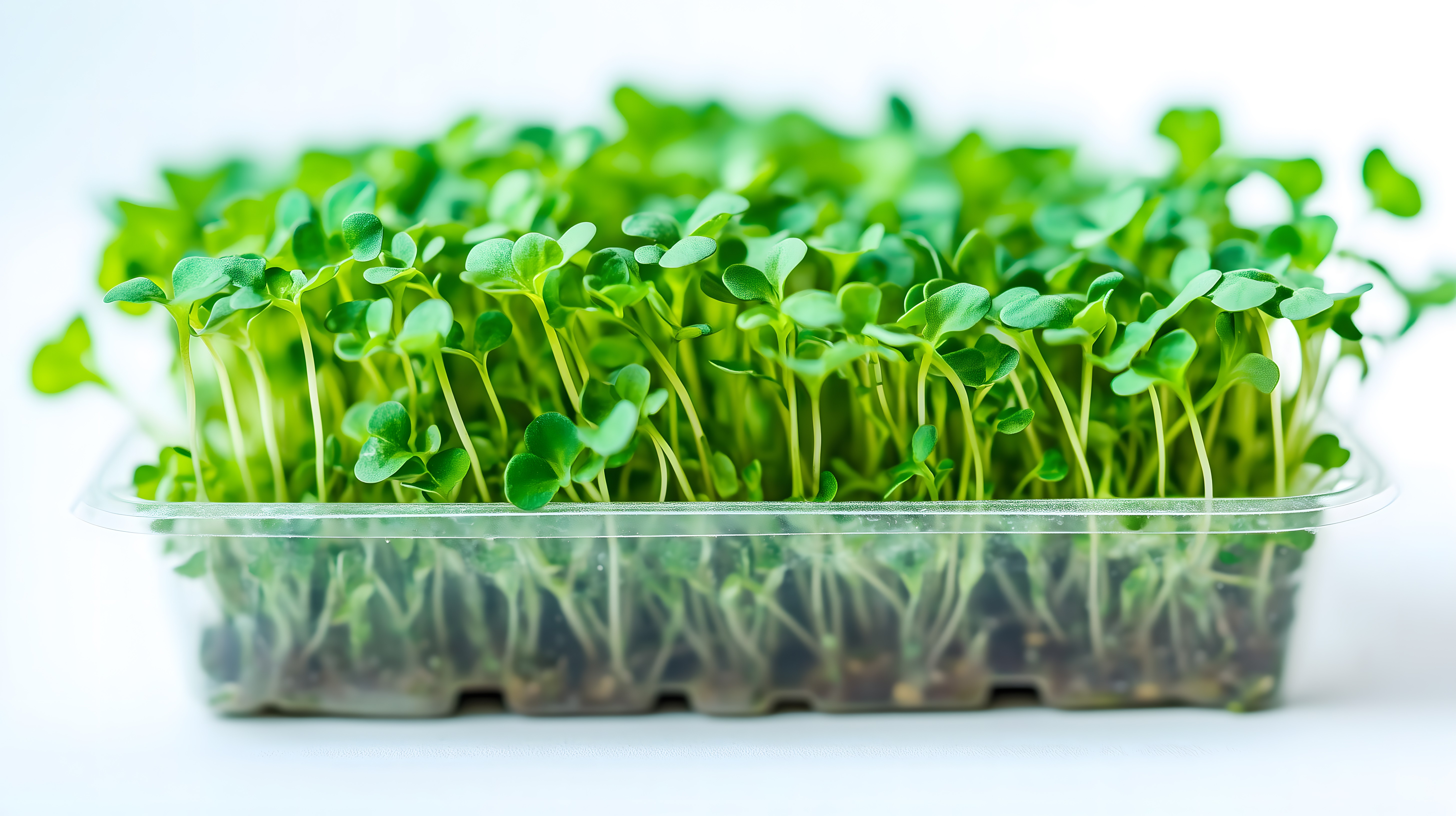 Dieses Foto zeigt eine Nahaufnahme von frischen, grünen Kressepflänzchen, die in einem transparenten Behälter wachsen. Die zarten, saftigen Blättchen bilden einen harmonischen, dichten Teppich und strahlen Frische und Vitalität aus. Das Bild eignet sich hervorragend als kostenloses Stockfoto für verschiedene Einsatzbereiche wie Blog-Beiträge, Newsletter, Social-Media-Posts oder Werbematerial zum Thema gesunde Ernährung, Vertical Farming oder Ackerbau. Die hochauflösende Fotografie unter Creative-Commons-Lizenz bietet viel Freiraum für kreative Gestaltung.