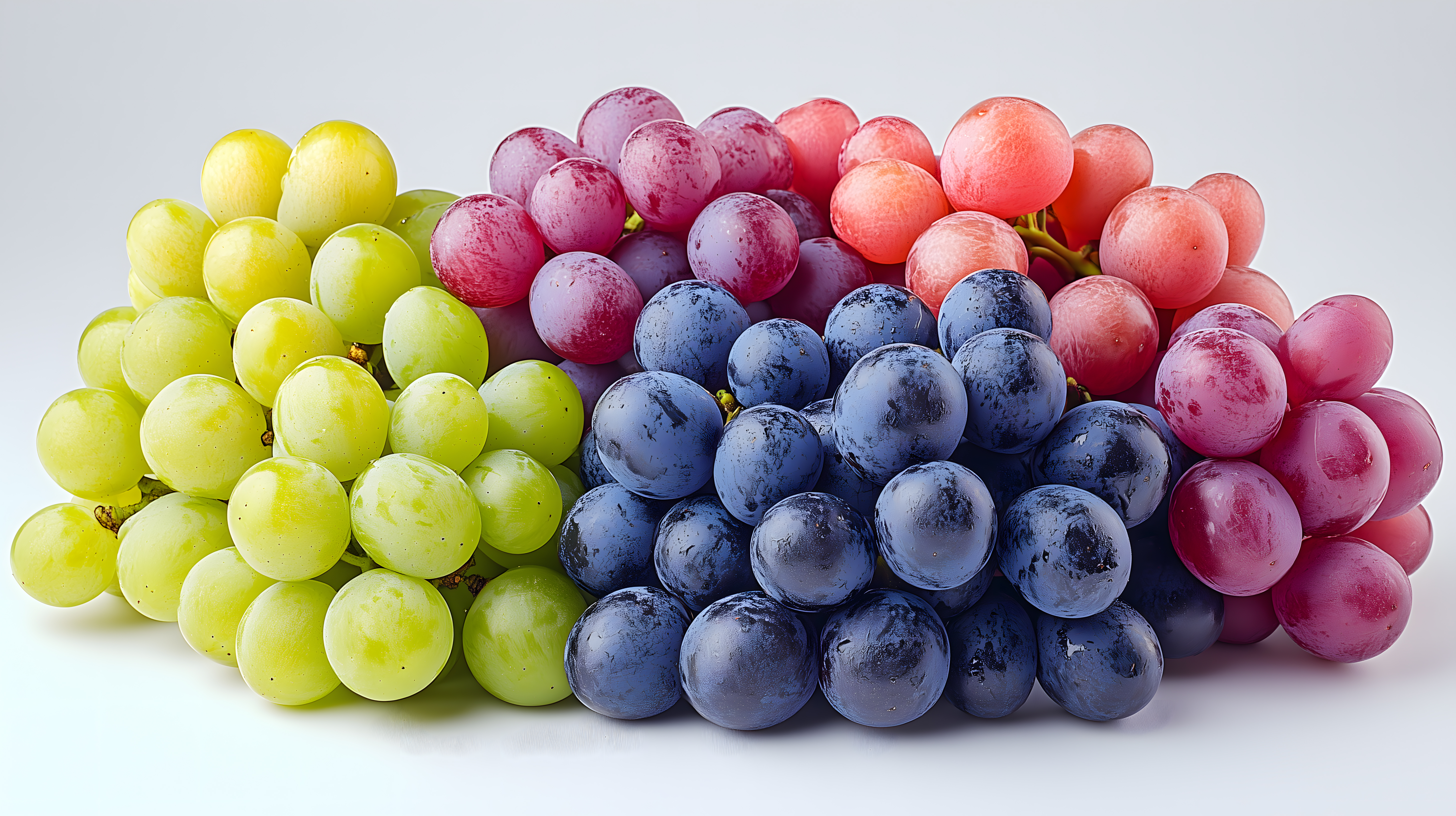 Das Bild zeigt eine vielfältige Anordnung von reifen Weintrauben in verschiedenen Farbtönen auf einem hellen Hintergrund. Die Traube-Cluster sind in einem farbenfrohen Regenbogen-Muster angeordnet, das die Schönheit und Vielfalt der Früchte betont. Die Trauben wirken frisch und saftig, mit glänzender Oberfläche und leichter Spannkraft.
