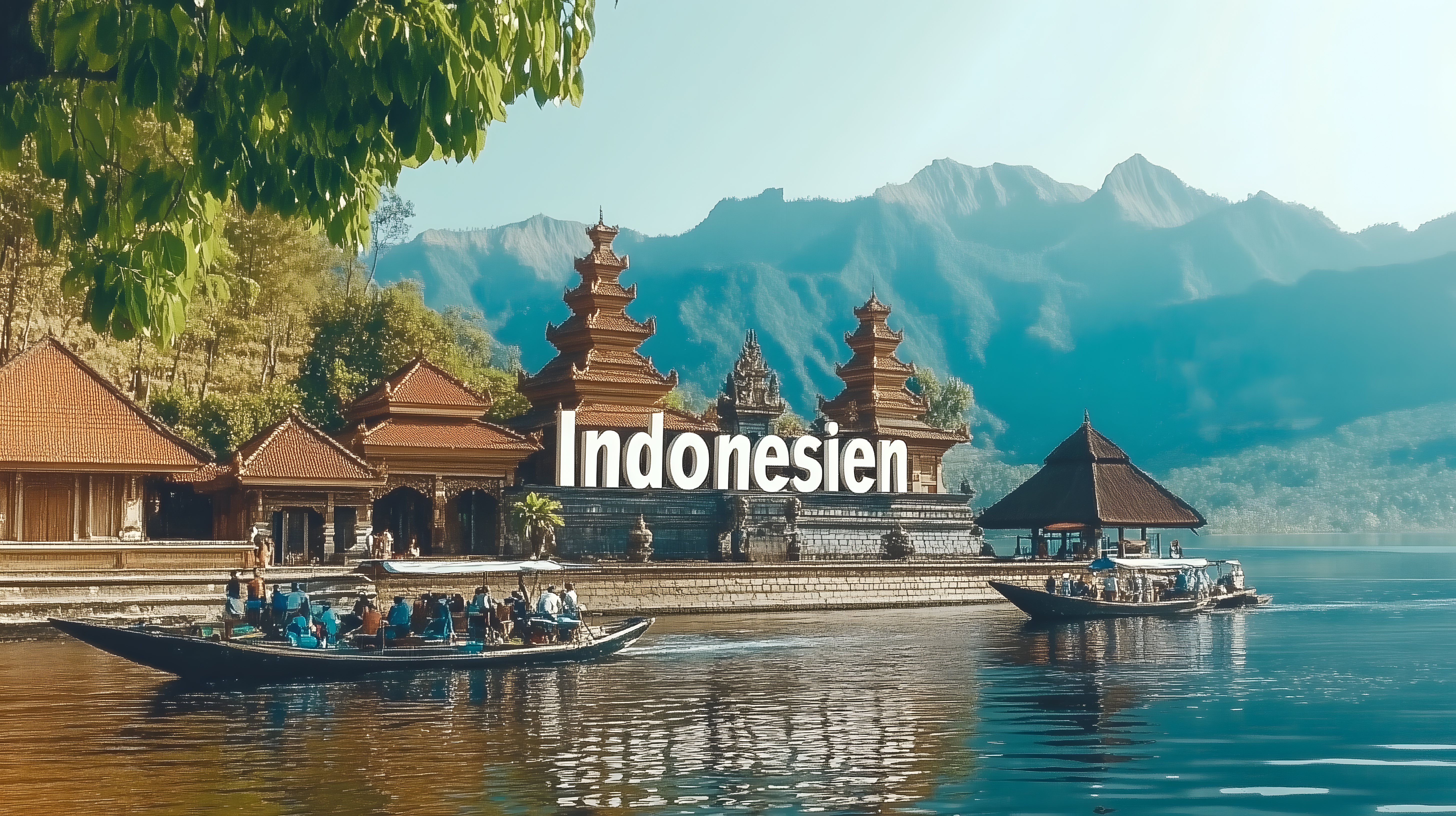 Das Bild zeigt eine malerische Tempelanlage am Ufer eines ruhigen Sees in Indonesien. Im Vordergrund sind traditionelle Boote zu sehen, auf denen Touristen den Ort erkunden. Die Tempel selbst haben eine typisch indonesische Architektur mit ihren spitzen Dächern und Türmen. Im Hintergrund ragen majestätische Berge auf, die sich im klaren Wasser des Sees widerspiegeln. Die grüne Vegetation und die warmen Farbtöne verleihen der Szene eine friedliche, entspannende Atmosphäre. Dieses Foto eignet sich ideal als Hintergrund für Blogs, Newsletter oder Werbematerialien rund um Reisen, Tourismus und fernöstliche Kulturen. Es ist in hoher Auflösung verfügbar und unter einer Creative-Commons-Lizenz frei nutzbar.