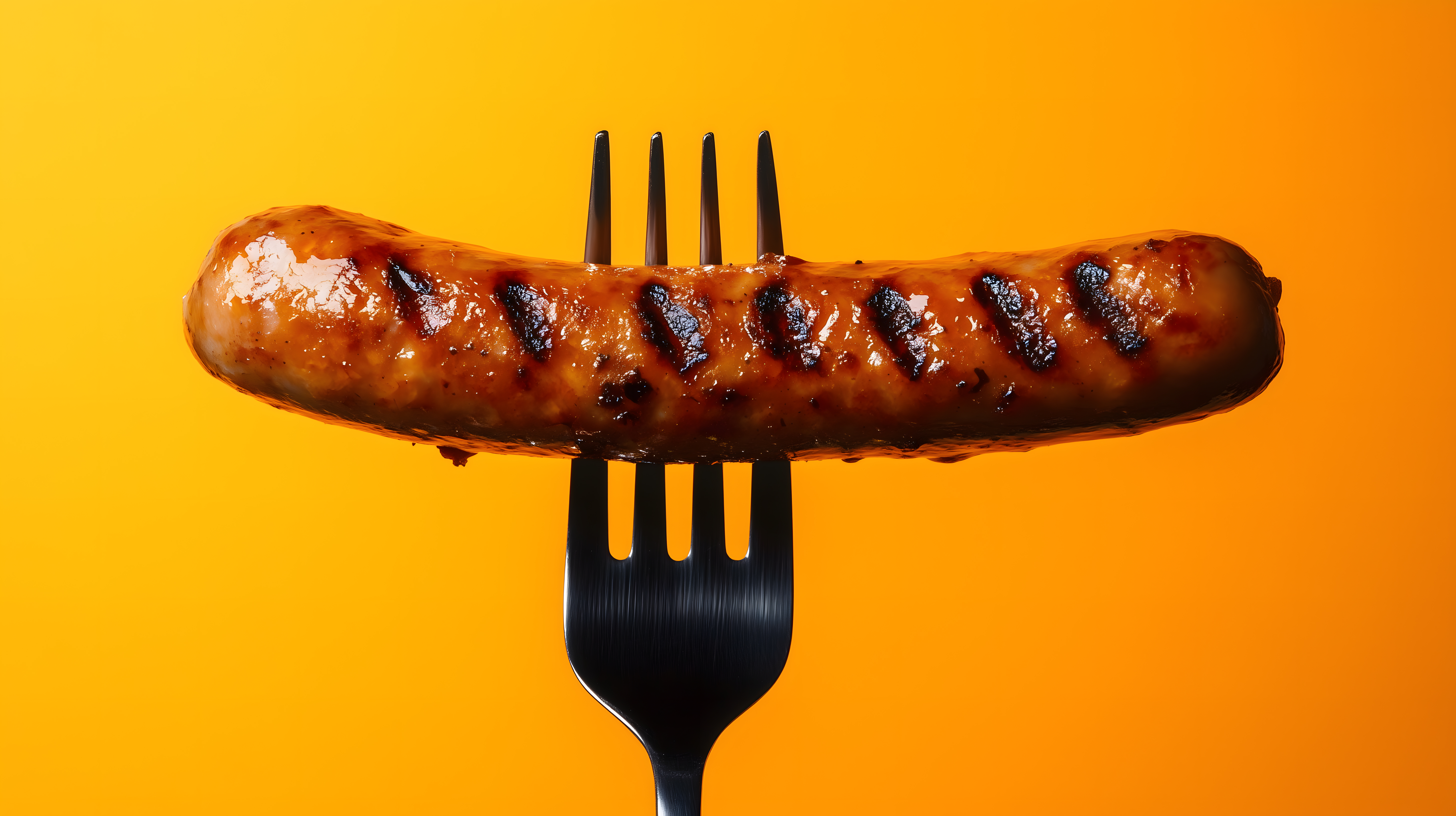 Das Foto zeigt eine saftige, gegrillte Bratwurst, die auf einer schwarzen Gabel positioniert ist. Der orange Hintergrund verleiht dem Bild eine lebendige, appetitliche Atmosphäre. Die Bratwurst ist mit leicht gebräunten, gegrillten Streifen überzogen, was auf eine perfekte Zubereitung hindeutet. Dieses hochwertige Stockfoto eignet sich hervorragend für die Verwendung in Kochblogs, Rezeptsammlungen, Werbematerialien für Grillsaison oder saisonale Lebensmittel-Angebote. Mit seiner klaren Fokussierung auf das Hauptmotiv und der stimmungsvollen Farbgestaltung ist es ein echtes Highlight für kreative Projekte in hoher Auflösung und unter Creative-Commons-Lizenz.