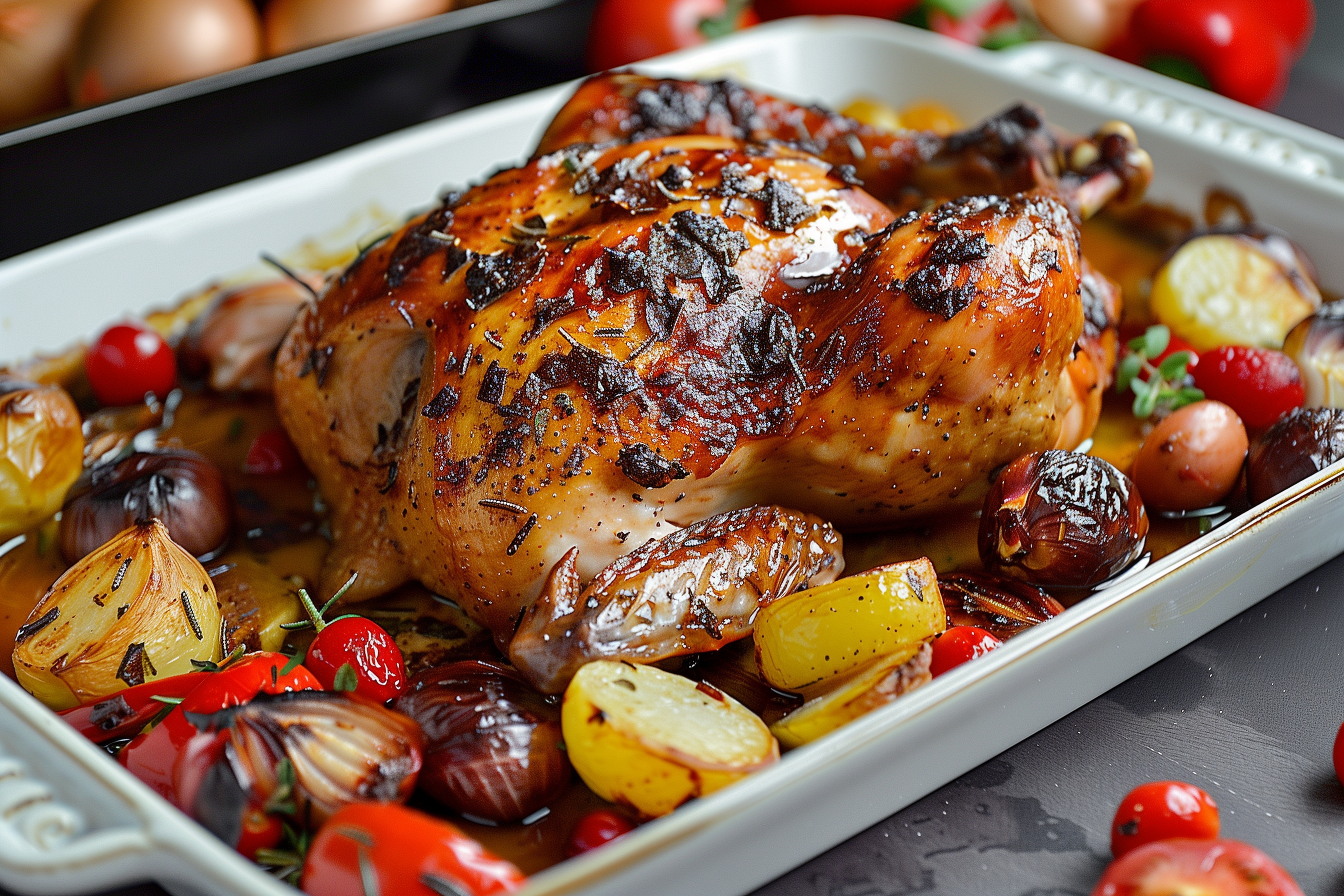 Das Bild zeigt ein ofengebratenes Hähnchen, das mit verschiedenem Gemüse wie Tomaten, Kartoffeln und Zwiebeln zubereitet wurde. Das knusprig-goldbraune Geflügel ist mit Kräutern und Gewürzen verfeinert und liegt auf einem weißen Teller angerichtet. Das appetitliche Gericht wird von farbenfrohem Gemüse umgeben, was eine leckere und gesunde Mahlzeit verspricht. Dieses hochwertige Stockfoto eignet sich ideal für Beiträge in Blogs, Newslettern oder Social-Media-Kanälen rund um das Thema Kochen, Rezepte und gesunde Ernährung. Die Fotografie ist in hoher Auflösung verfügbar und steht unter einer Creative-Commons-Lizenz zur Verfügung.