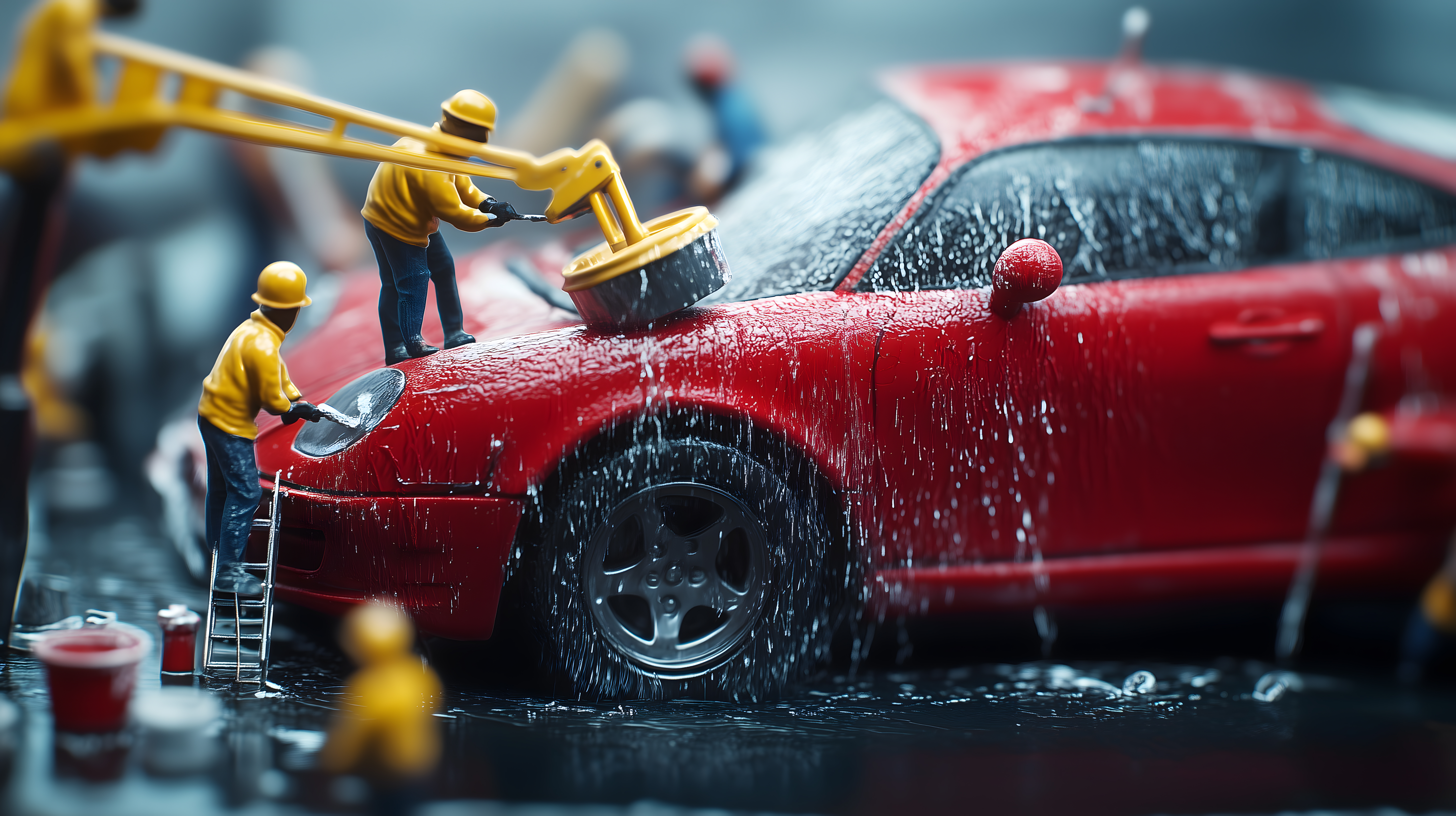 Das Bild zeigt eine detaillierte Miniaturszene, in der Modellfiguren ein rotes Fahrzeug reinigen. Die Perspektive ist nah und konzentriert sich auf die kleinsten Details der Autowäsche. Das Rot des Autos kontrastiert mit den gelben Werkzeugen und Reinigerausrüstung, was eine lebendige und farbenfrohe Komposition ergibt. Diese realistische Szene eignet sich hervorragend für den Einsatz in Medien, Blogs, Newslettern oder Werbematerialien, zum Beispiel im Kontext von Automobilreinigung, Handwerks- oder Hobbythemen. Als kostenloses Stockfoto in hoher Auflösung und unter Creative-Commons-Lizenz verfügbar, bietet dieses Bild viele Möglichkeiten für kreative Gestaltung.