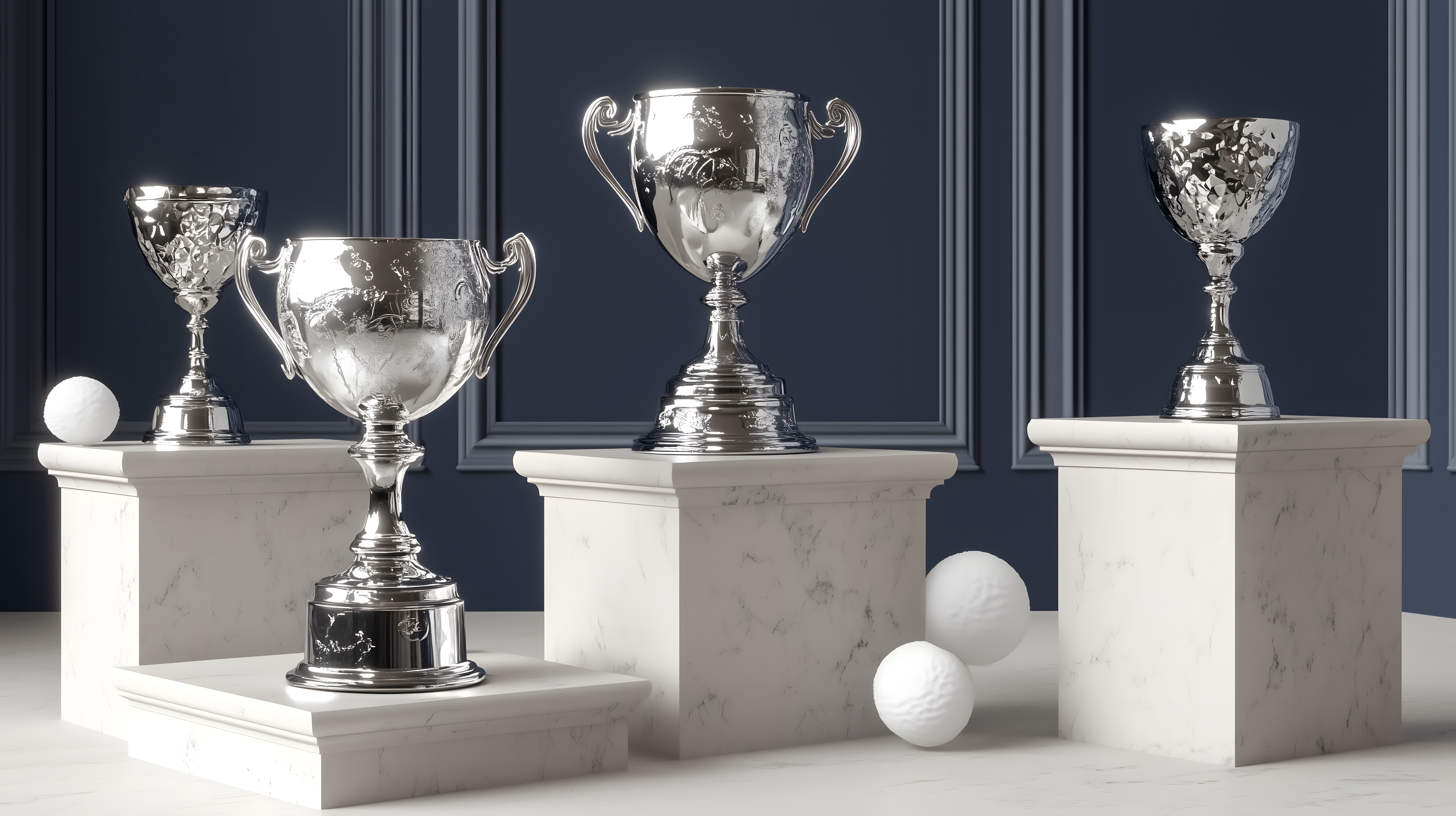 Dieses elegante Schwarz-Weiß-Foto zeigt drei hochglanzpolierte Silberpokale auf weißen Marmorsockeln. Die Pokale sind verschieden groß und mit aufwendigen Verzierungen versehen, was ihnen ein luxuriöses, klassisches Aussehen verleiht. Die dunkle Hintergrundfarbe lässt die Pokale umso stärker hervortreten und betont ihre Bedeutung als Trophäen und Auszeichnungen für Wettbewerbe und Erfolge. Dieses Foto eignet sich hervorragend für den Einsatz in Grafikdesigns, Werbematerialien oder als Hintergrundbild für Corporate Designs. Als hochauflösendes, kostenloses Stockfoto unter der Creative-Commons-Lizenz ist es frei verwendbar.