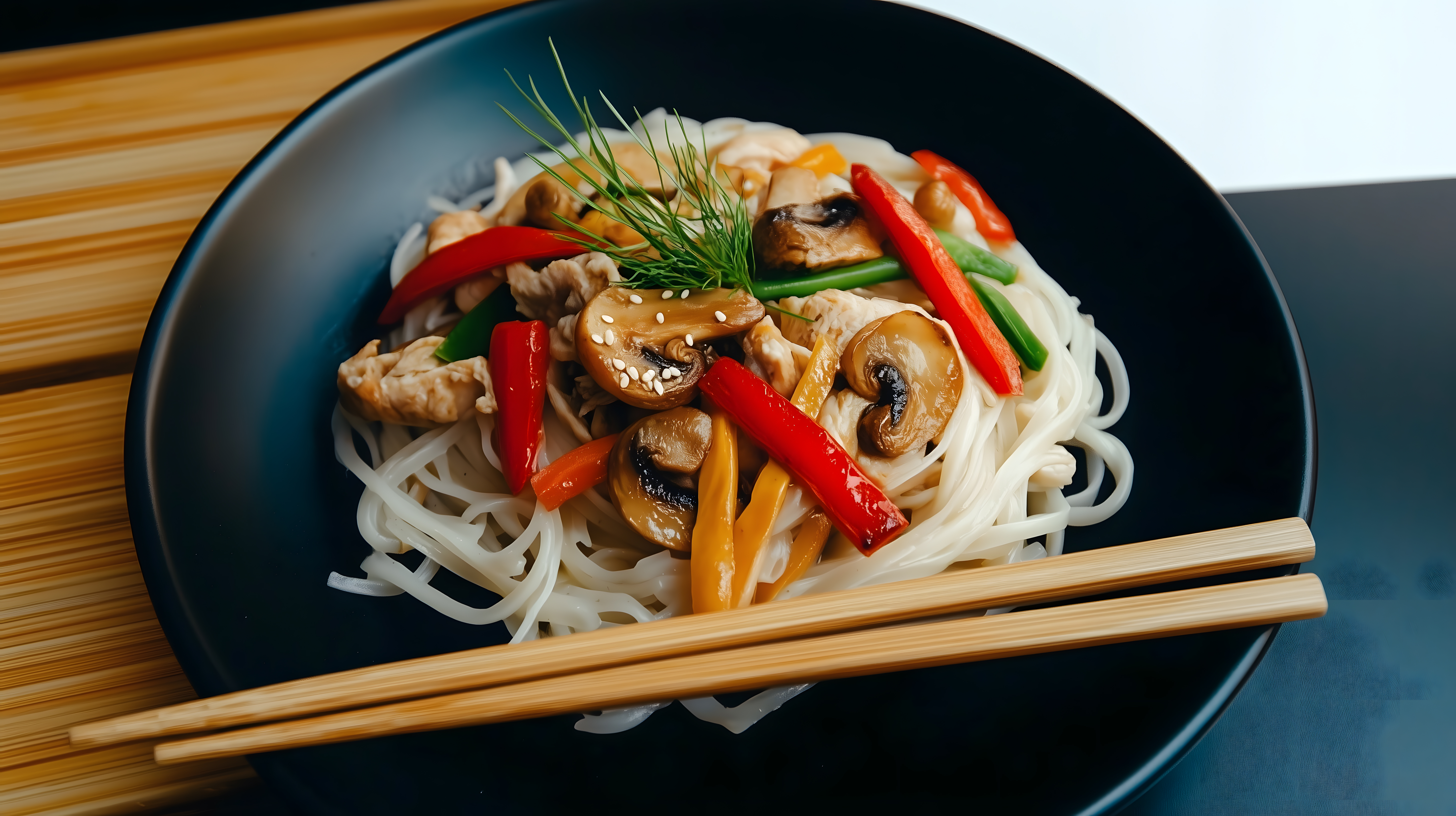 Das Foto zeigt eine leckere asiatische Nudelmahlzeit. Auf einem schwarzen Teller sind lange, weiße Reisnudeln mit saftigen Stücken von gegrilltem Hühnchen, frischen Pilzen, bunter Paprika und knackigem Gemüse angerichtet. Die Zutaten sind kunstvoll angeordnet und mit frischen Dillzweigen dekoriert. Die Farbkomposition aus den warmen Braun- und Rottönen des Hühnchens, den saftigen Gelb- und Rottönen des Gemüses sowie den hellen Nudeln verleiht dem Gericht einen appetitlichen, authentischen asiatischen Flair. Mit den bereitliegenden Essstäbchen ist diese Mahlzeit perfekt für den Genuss à la Asien. Dieses hochwertige, kostenlose Stockfoto in hoher Auflösung eignet sich hervorragend für Rezeptblogs, Foodmagazine, Kochbücher oder Werbekampagnen unter der Creative-Commons-Lizenz.
