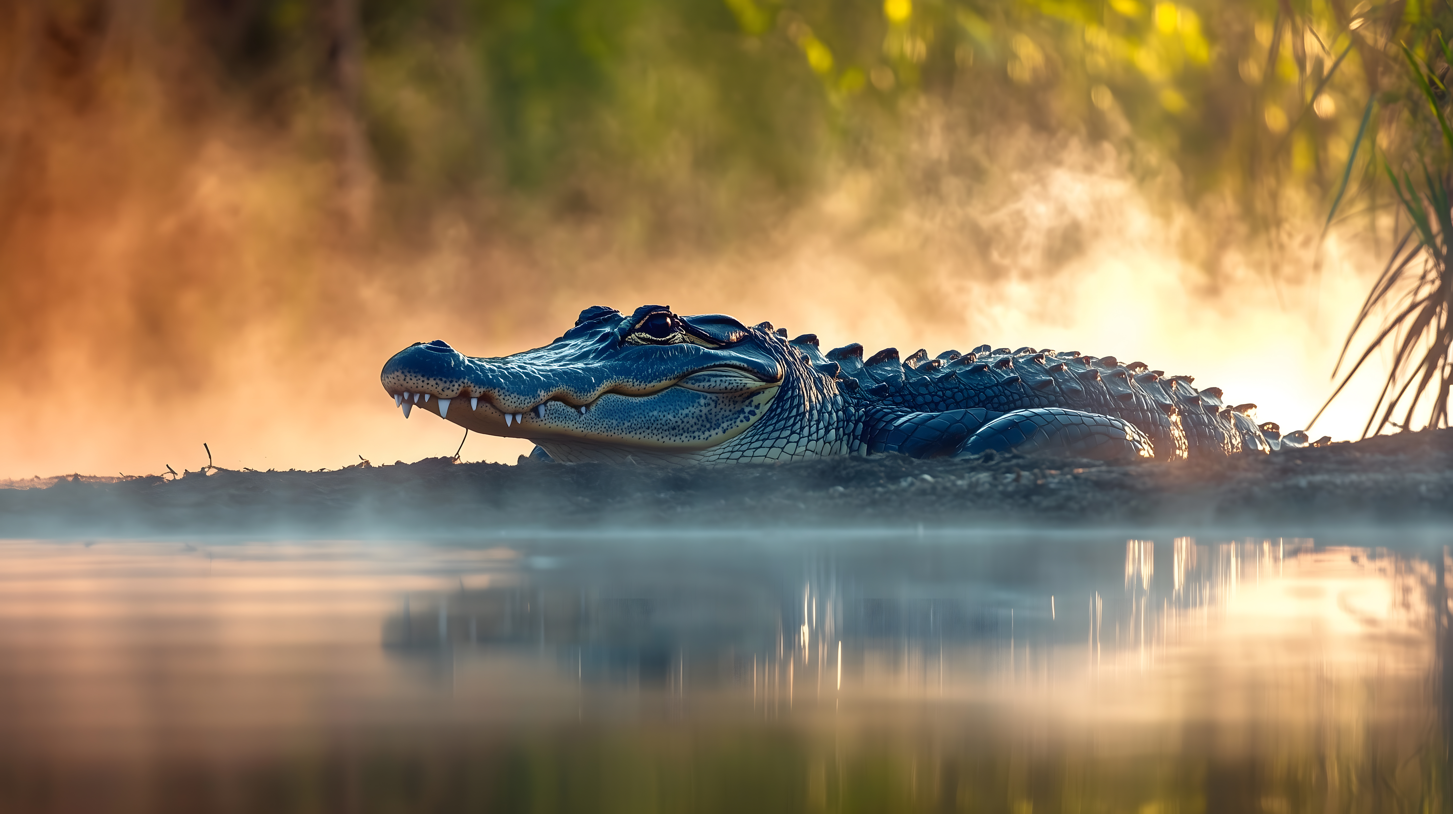 Das beeindruckende Foto zeigt einen majestätischen Alligator, der teilweise aus dem Wasser auftaucht. Die neblige, goldene Beleuchtung verleiht dem Bild eine geheimnisvolle, fast mystische Atmosphäre. Der Alligator mit seinem markanten Kiefer und dem imposanten Panzer ist in seiner Umgebung perfekt getarnt und lauert darauf, seine Beute zu ergreifen. Dieses Bild eignet sich hervorragend als Stockfoto für Blogs, Newsletter, Social-Media-Beiträge oder Werbeanzeigen rund um Themen wie Natur, Wildtiere, Gefahr oder düstere Stimmungen. Das Foto ist in hoher Auflösung verfügbar und unter einer Creative-Commons-Lizenz frei nutzbar.