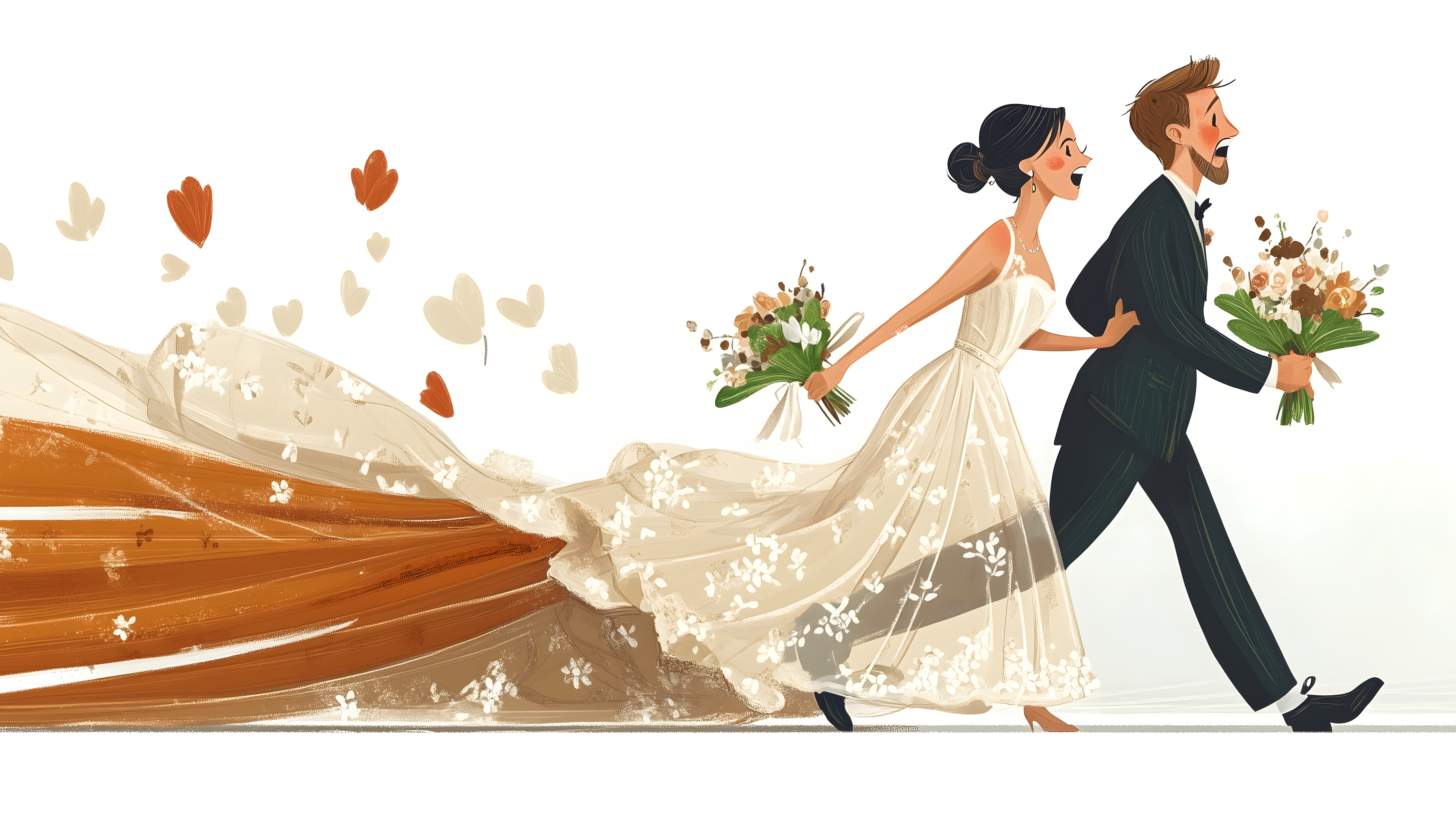 Diese fröhliche Illustration zeigt ein glückliches Hochzeitspaar, das sich innig umarmt. Der Bräutigam in elegantem Anzug und die Braut in einem wunderschönen Hochzeitskleid stehen im Vordergrund, umgeben von fliegenden Herzen und Blüten. Die bunte, lebendige Darstellung strahlt eine romantische und ausgelassene Stimmung aus und eignet sich perfekt als Stockfoto für Hochzeitsthemen, Social Media-Posts oder Werbematerial. Mit seiner hohen Auflösung und Creative-Commons-Lizenz kann dieses Bild kostenlos und ohne Einschränkungen für verschiedenste Zwecke genutzt werden.