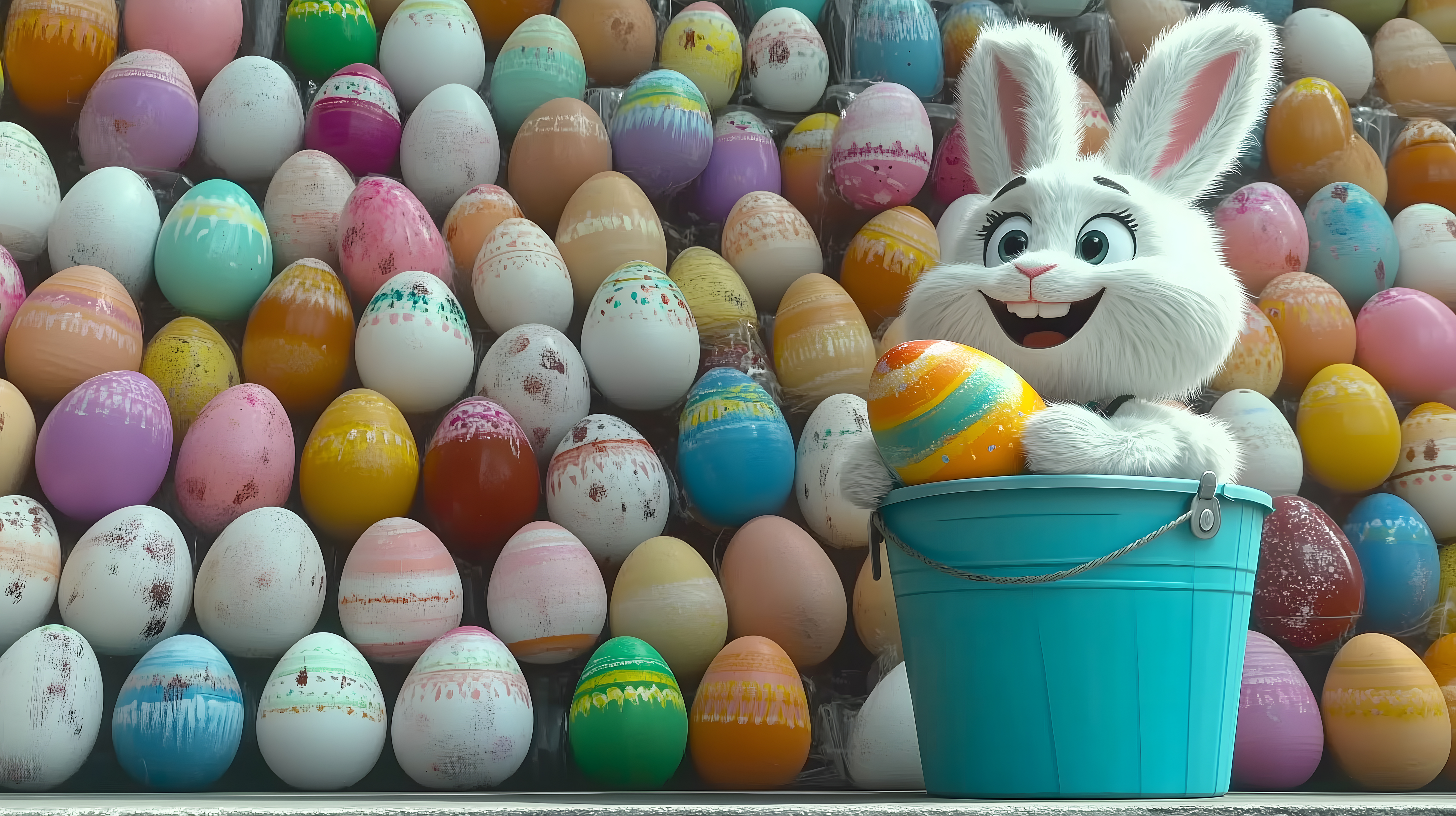 Dieses farbenfrohe Bild zeigt einen bunten Osterstrauss mit vielen bemalten Eiern und einem lachenden Osterhasen in einem blauen Eimer. Die Komposition präsentiert eine Vielzahl von Pastellfarben und Mustern, die eine festliche und kreative Atmosphäre vermitteln. Dieses hochauflösende Stockfoto eignet sich hervorragend für den Einsatz in Blogs, Newslettern, Social-Media-Kampagnen oder Werbematerialien rund um Ostern und den Frühling. Das Bild steht unter der kostenlosen Creative-Commons-Lizenz zur Verfügung.