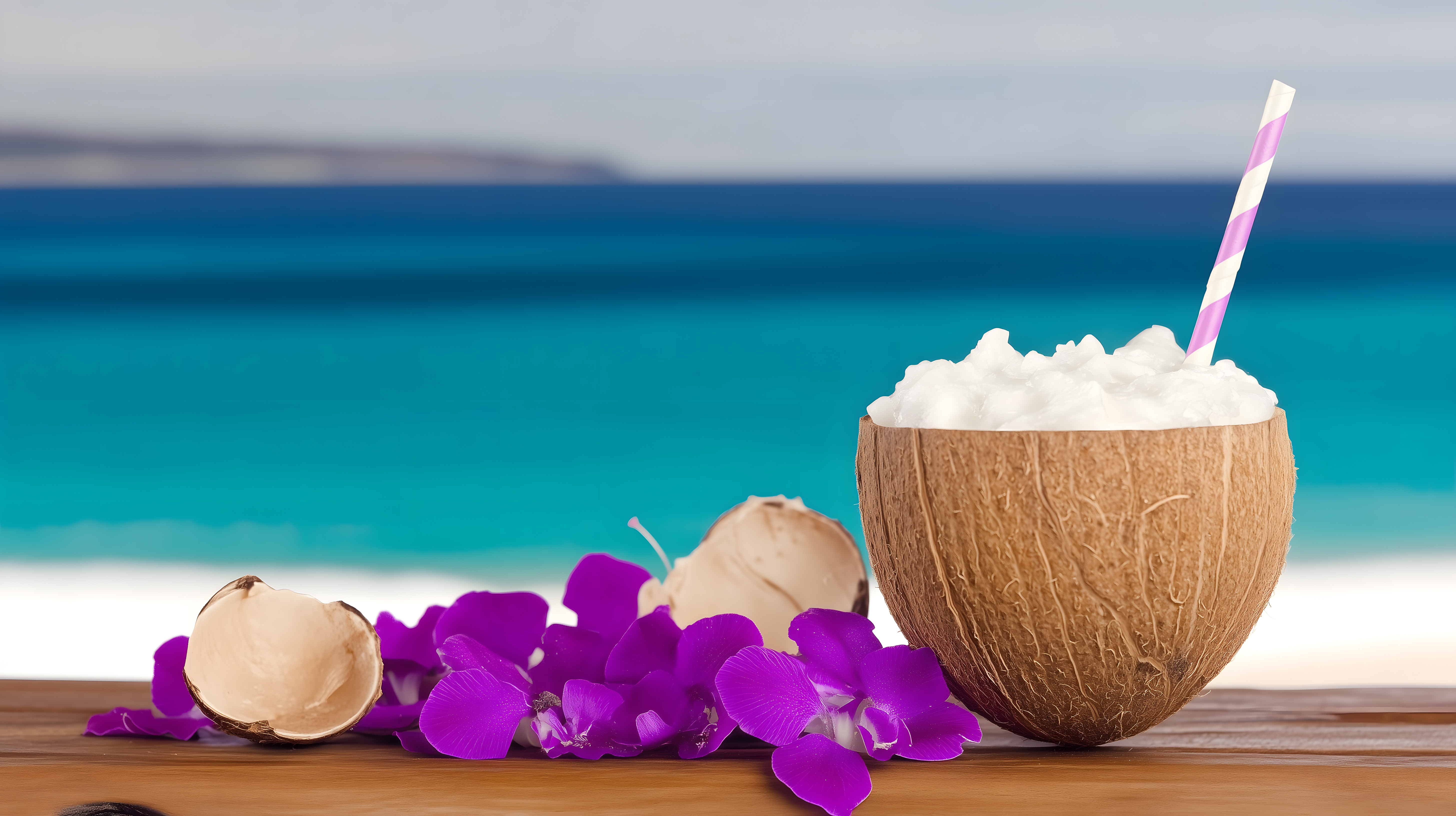 Dieses Foto zeigt einen tropischen Cocktail in einer Kokosnuss-Schale, dekoriert mit Kokosraspeln und einer auffälligen, bunten Trinkröhre. Der Cocktail befindet sich vor einer traumhaften Kulisse mit türkisblauem Meer und einem wolkenlosen Horizont. Im Vordergrund sind außerdem lila Blüten zu sehen, die eine natürliche, sommerliche Stimmung erzeugen. Dieses Bild eignet sich hervorragend als kostenloses Stockfoto für Urlaubsreportagen, Social-Media-Beiträge, Reiseprospekte oder Werbematerialien rund um das Thema Reisen, Wellness und Genuss.
