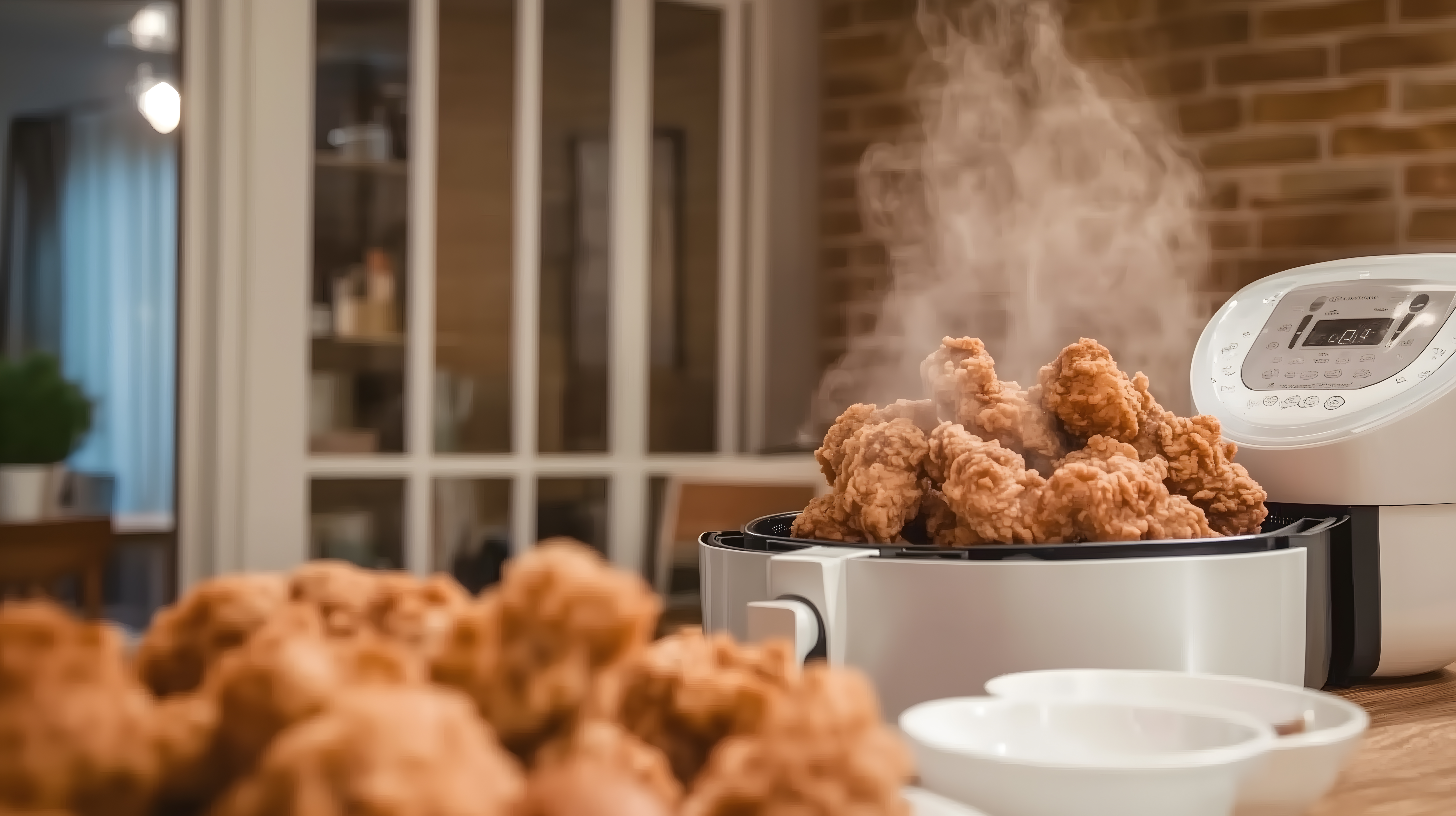 Das Bild zeigt eine Nahaufnahme von frisch zubereitetem, knusprig frittierten Hähnchenflügeln, die gerade aus einer Heißluftfritteuse entnommen wurden. Die goldbraune Kruste der Hähnchenteile ist deutlich zu erkennen, und aus der Fritteuse steigt Dampf auf. Das Bild vermittelt den Eindruck von frisch zubereiteten, leckeren Snacks, die ideal für Partys, Filme oder die Brotzeit sind. Als kostenloses Stockfoto in hoher Auflösung und unter Creative-Commons-Lizenz eignet sich das Bild perfekt für den Einsatz in Blogs, Newslettern oder Social-Media-Beiträgen zum Thema Kochen, Essen und Gastronomie.