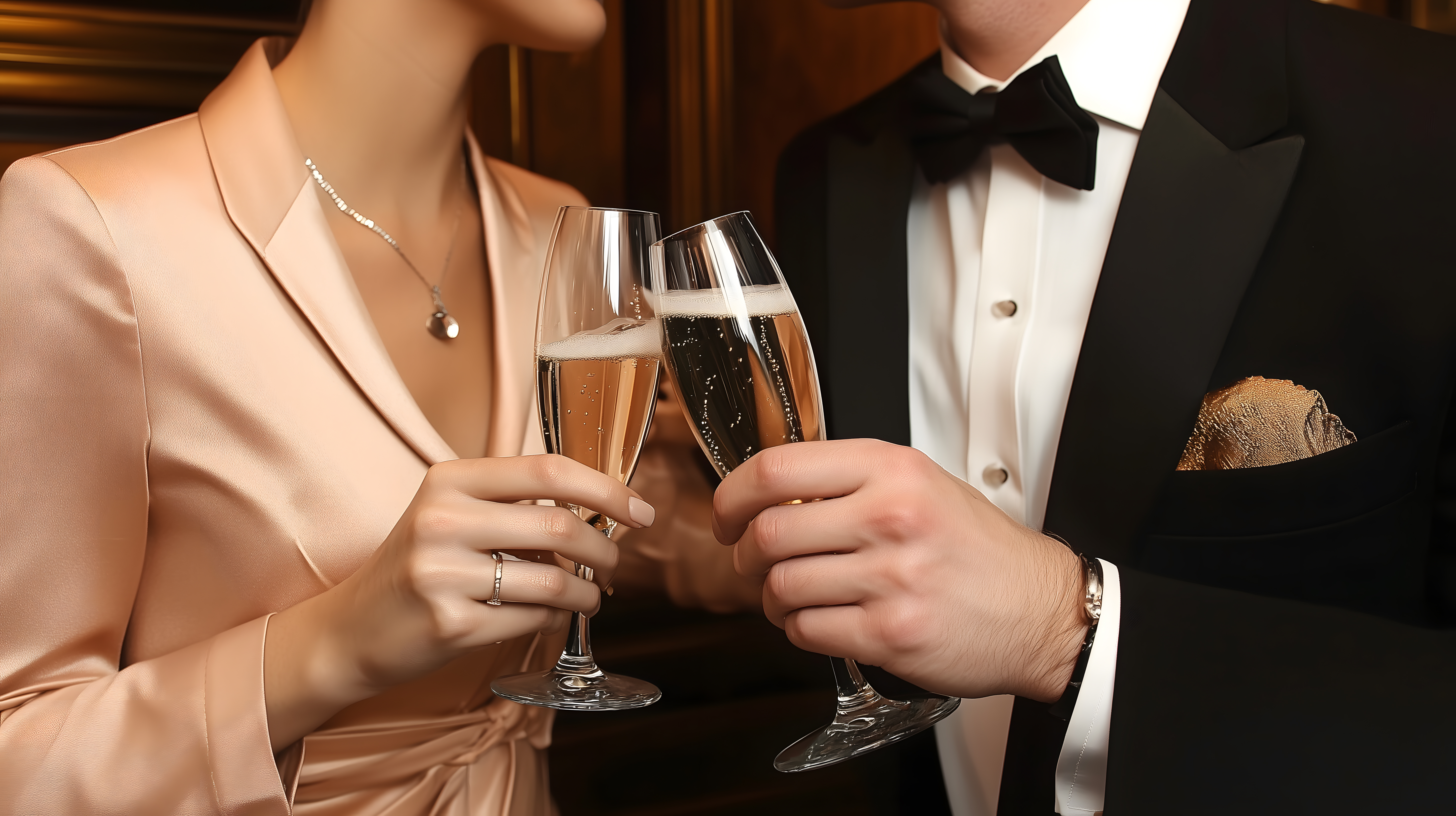 Das Bild zeigt ein elegantes Paar in festlicher Abendgarderobe, das mit Champagnergläsern anstößt. Der Mann trägt einen schwarzen Smoking mit Fliege, die Frau ein figurbetontes Samtkleid in zartem Rosé. Sie halten ihre Gläser hoch, als würden sie einen besonderen Moment zelebrieren. Das Bild strahlt Exklusivität und Lebensfreude aus und eignet sich hervorragend für den Einsatz in Artikeln oder auf Websites rund um Themen wie Hochzeit, Verlobung, Geburtstag oder andere festliche Anlässe. Als kostenloses Stockfoto in hoher Auflösung und unter einer Creative-Commons-Lizenz verfügbar, können die Bildrechte unkompliziert genutzt werden.
