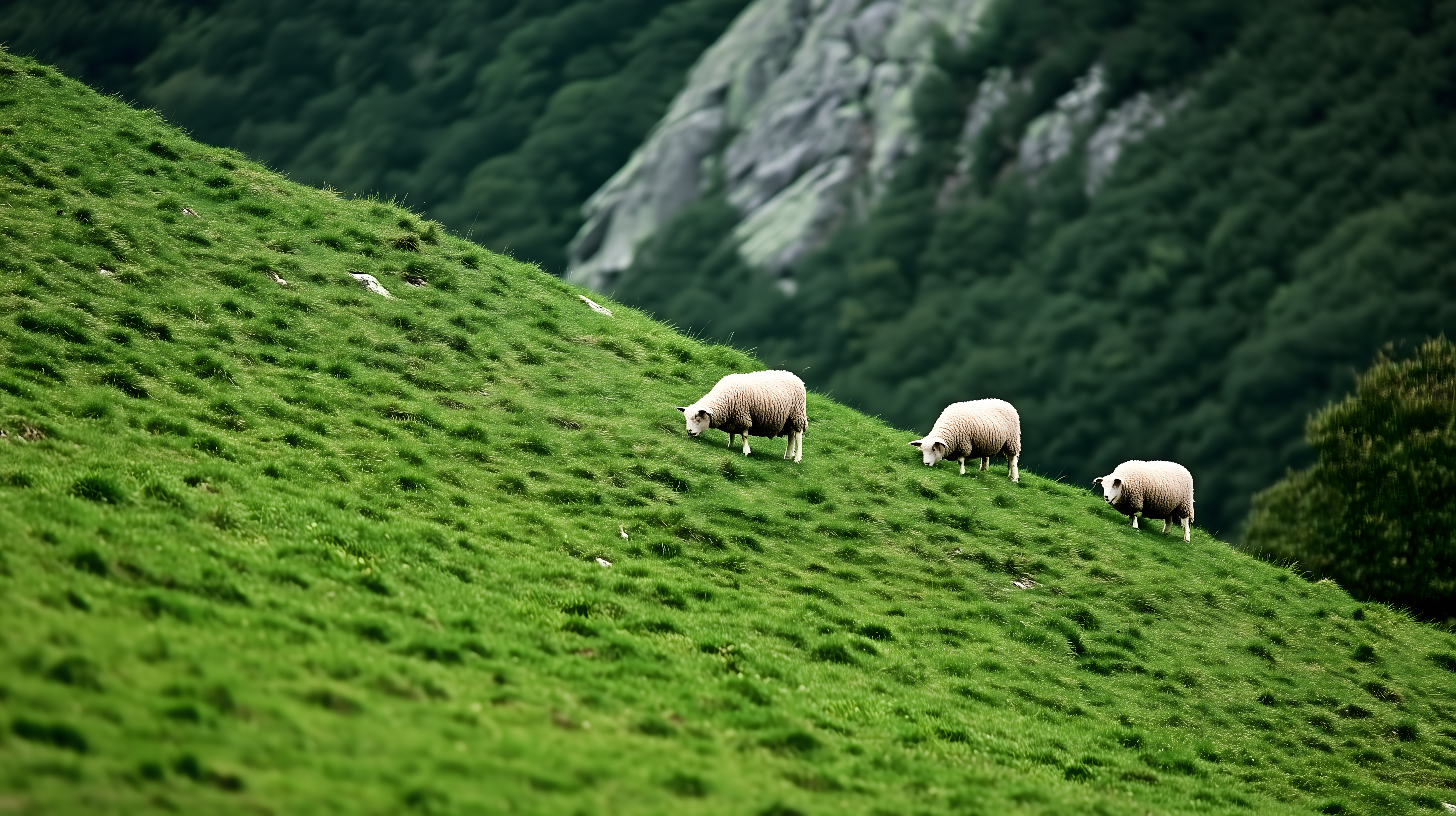 Dieses Foto zeigt eine malerische Berglandschaft in Irland. Im Vordergrund weiden friedlich drei Schafe auf einer saftig grünen Wiese, umgeben von sanften Hügeln und waldbedeckten Bergen im Hintergrund. Die Szenerie strahlt eine natürliche Ruhe und Idylle aus, die perfekt die ländliche Schönheit Irlands widerspiegelt. Dieses Stockfoto in hoher Auflösung kann beispielsweise für Blogbeiträge, Reiseprospekte oder Naturfotos genutzt werden und steht unter einer kostenlosen Creative-Commons-Lizenz zur Verfügung.