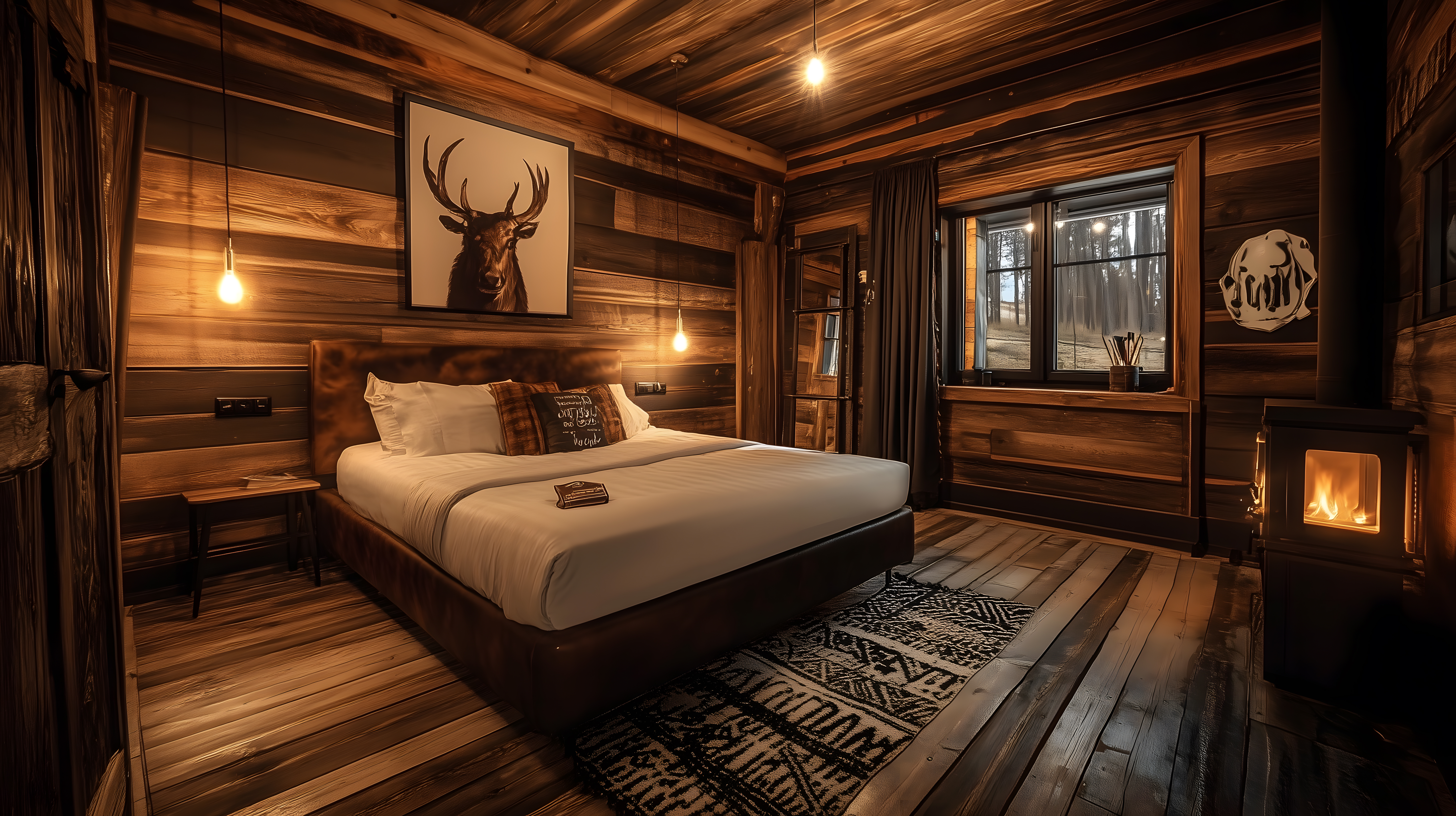 Dieses rustikale Holzhütten-Schlafzimmer strahlt eine gemütliche und einladende Atmosphäre aus. Der Raum ist mit natürlichen Materialien wie Holz und einem Kamin ausgestattet, was dem Interieur einen traditionellen, alpinen Stil verleiht. Das Bett ist in der Mitte platziert und mit einem schlichten, aber komfortablen Bettbezug ausgestattet. An den Wänden hängen dekorative Elemente wie ein Hirschgeweih, die dem Raum einen rustikalen Charakter verleihen. Die warme Beleuchtung und der freie Blick aus den Fenstern in die Natur schaffen eine entspannende und erholsame Stimmung. Dieses hochaufgelöste Stockfoto in Creative-Commons-Lizenz eignet sich ideal für die Verwendung in Blogs, Newslettern, Social-Media-Beiträgen oder Werbematerialien rund um Themen wie Inneneinrichtung, Reisen, Lifestyle oder Winterlandschaften.