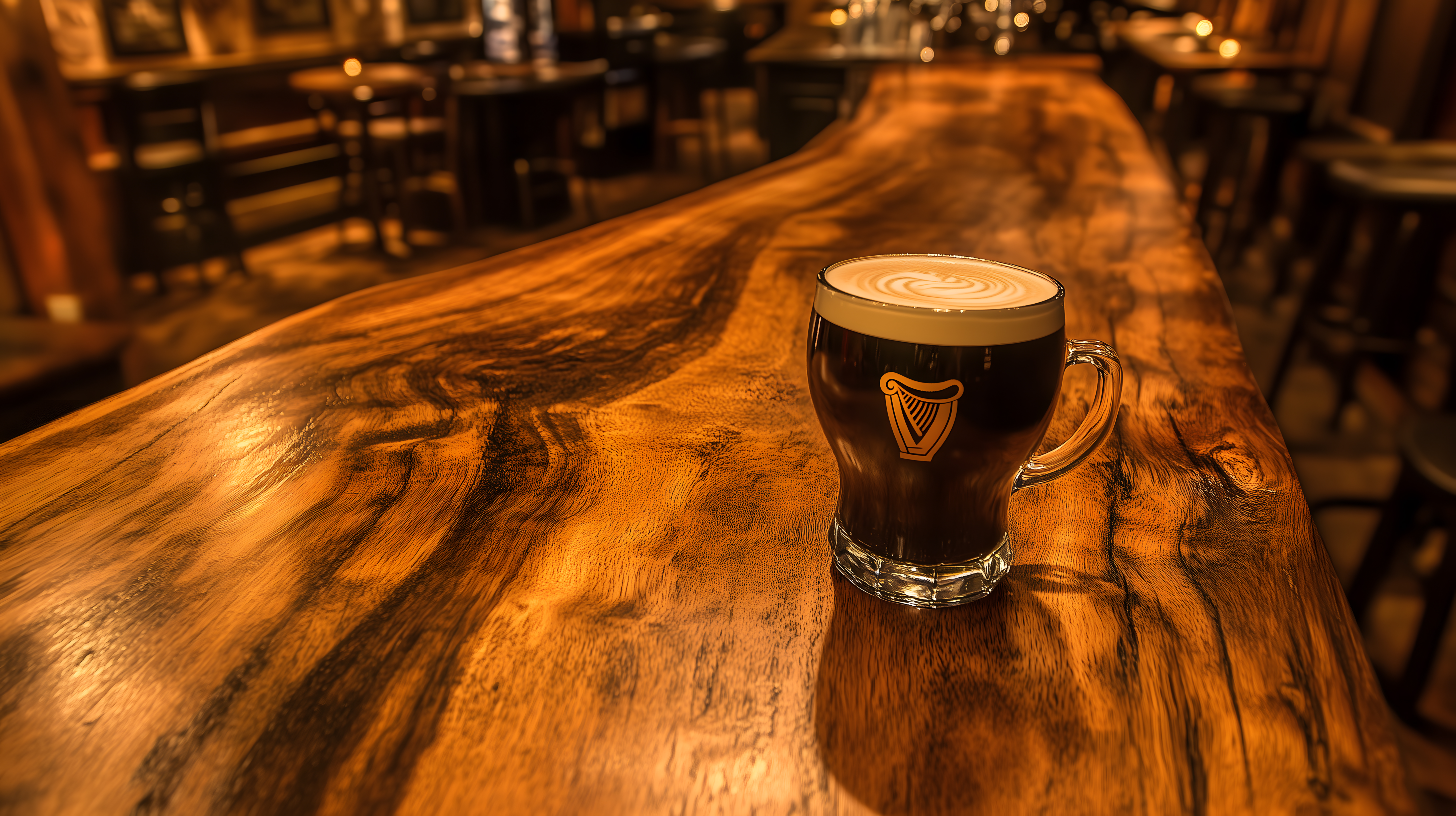 Dieses Foto zeigt eine authentische, traditionelle irische Bar mit einem langen, kunstvoll gearbeiteten Holztresen. Darauf steht ein Glas Guinness-Bier, das seinen charakteristischen dunklen Farbton und cremigen Schaum zeigt. Die warmen Holztöne und das gemütliche Ambiente vermitteln den typischen Charme eines irischen Pubs. Das Bild könnte perfekt für Werbung, Blogbeiträge oder Social-Media-Kanäle rund um das Thema Gastronomie, Reisen oder irische Kultur eingesetzt werden. Als kostenloses Stockfoto in hoher Auflösung und mit Creative-Commons-Lizenz ist es vielseitig verwendbar.