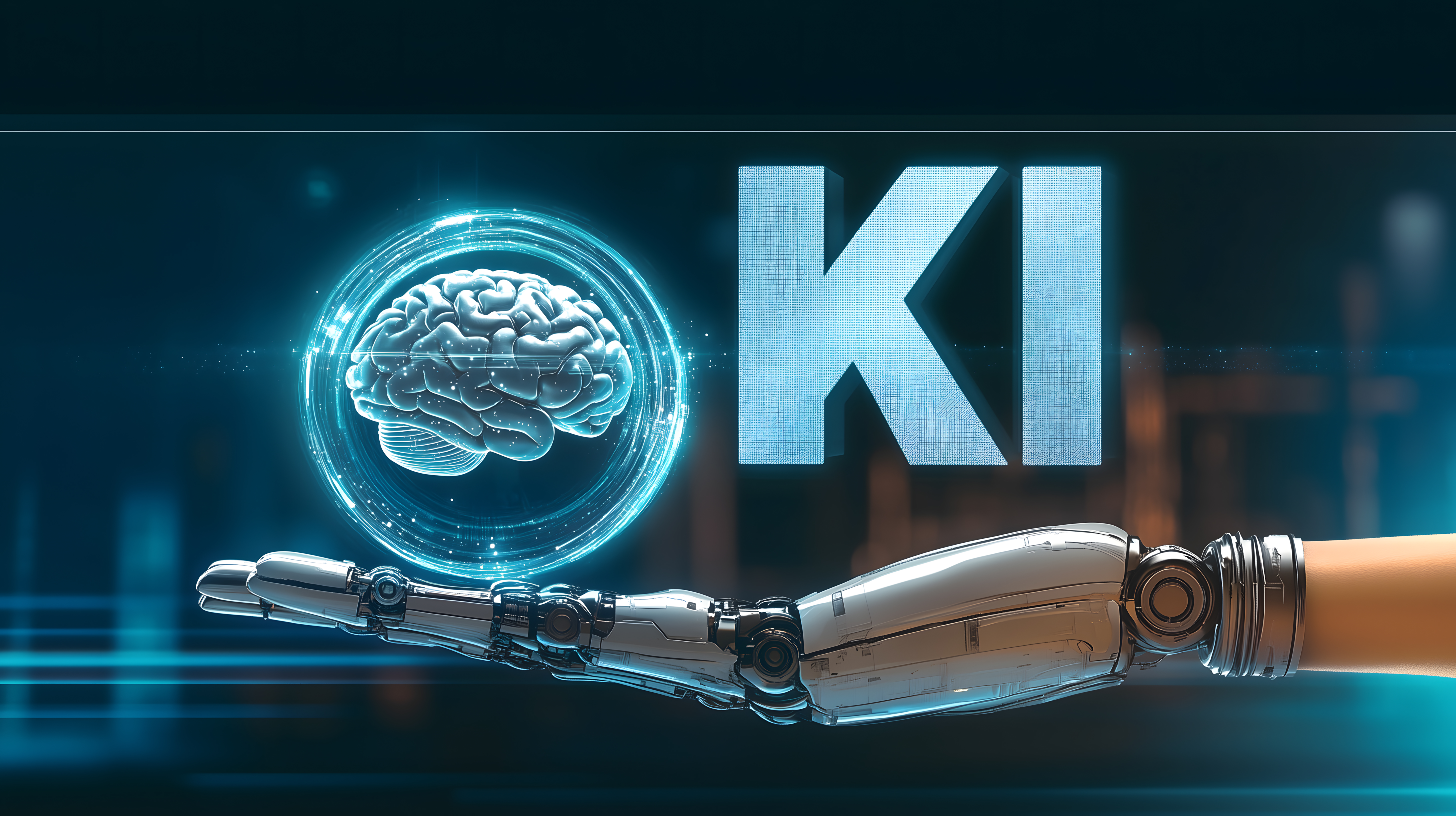 Dieses hochauflösende Stockfoto zeigt eine beeindruckende Darstellung von Künstlicher Intelligenz (KI) und moderner Robotertechnik. Im Zentrum prangt ein leuchtend blauer Gehirnscanner umgeben von futuristischen Grafiken und Schriftzügen. Daneben ist eine silberne Roboterhand zu sehen, die eine Verbindung zwischen Mensch und Maschine symbolisiert. Die Farbpalette in Blautönen und der dunkle Hintergrund verleihen dem Bild eine mystische, technologische Anmutung.