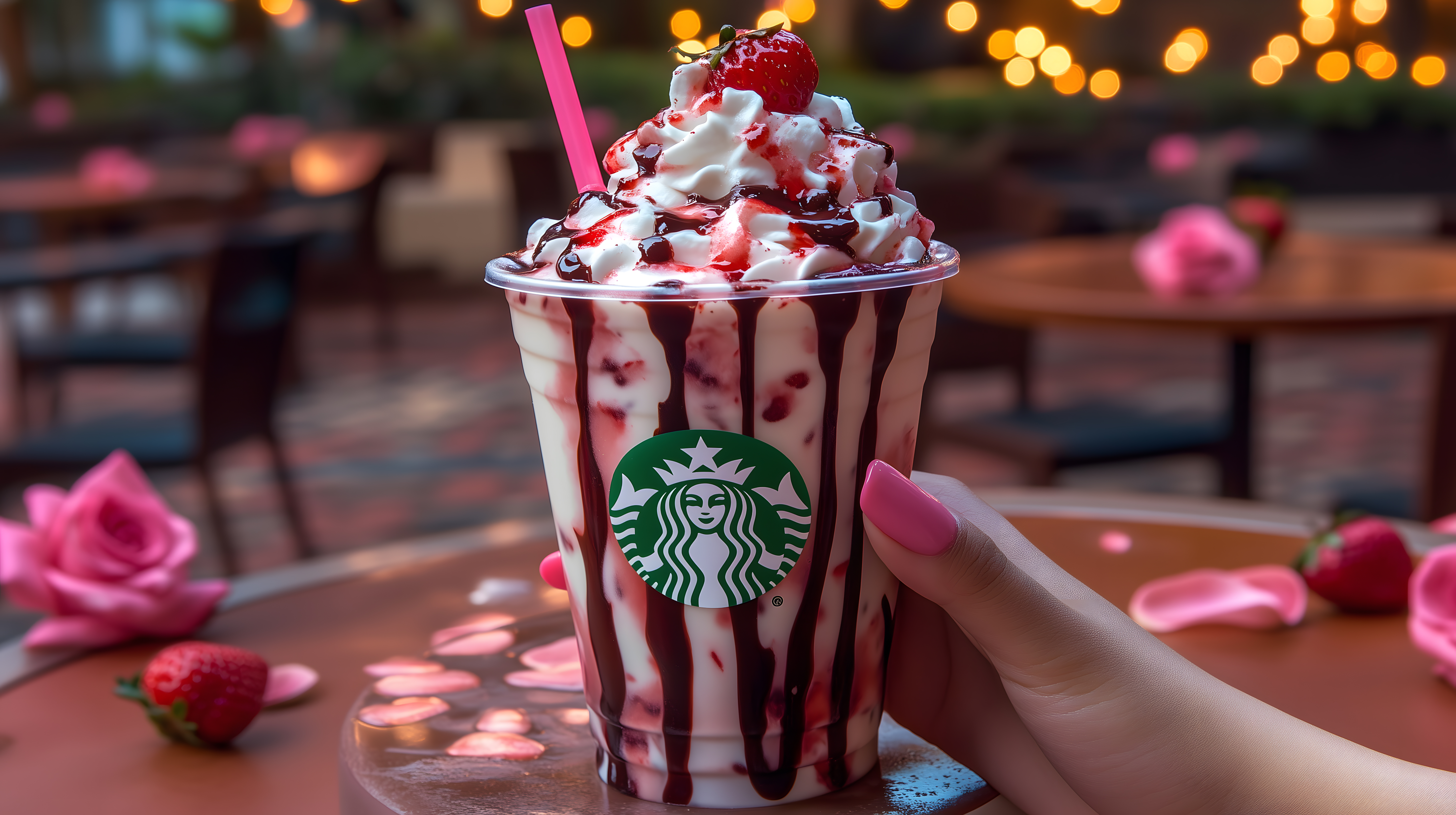 Das Bild zeigt ein köstliches Starbucks Frappuccino in einem hohen Glas. Die Milchcreme ist mit leckeren Erdbeerstückchen durchzogen und mit einer Sahnehaube sowie einer frischen Erdbeere dekoriert. Das Getränk ist vor einem festlich beleuchteten Hintergrund platziert, was eine gemütliche und weihnachtliche Stimmung vermittelt. Dieses hochauflösende Stockfoto eignet sich hervorragend für Blogs, Newsletter, Werbung oder Social-Media-Beiträge rund um Desserts, Getränke oder Weihnachtsdekorationen. Es steht unter der Creative-Commons-Lizenz zur kostenlosen Verwendung zur Verfügung.