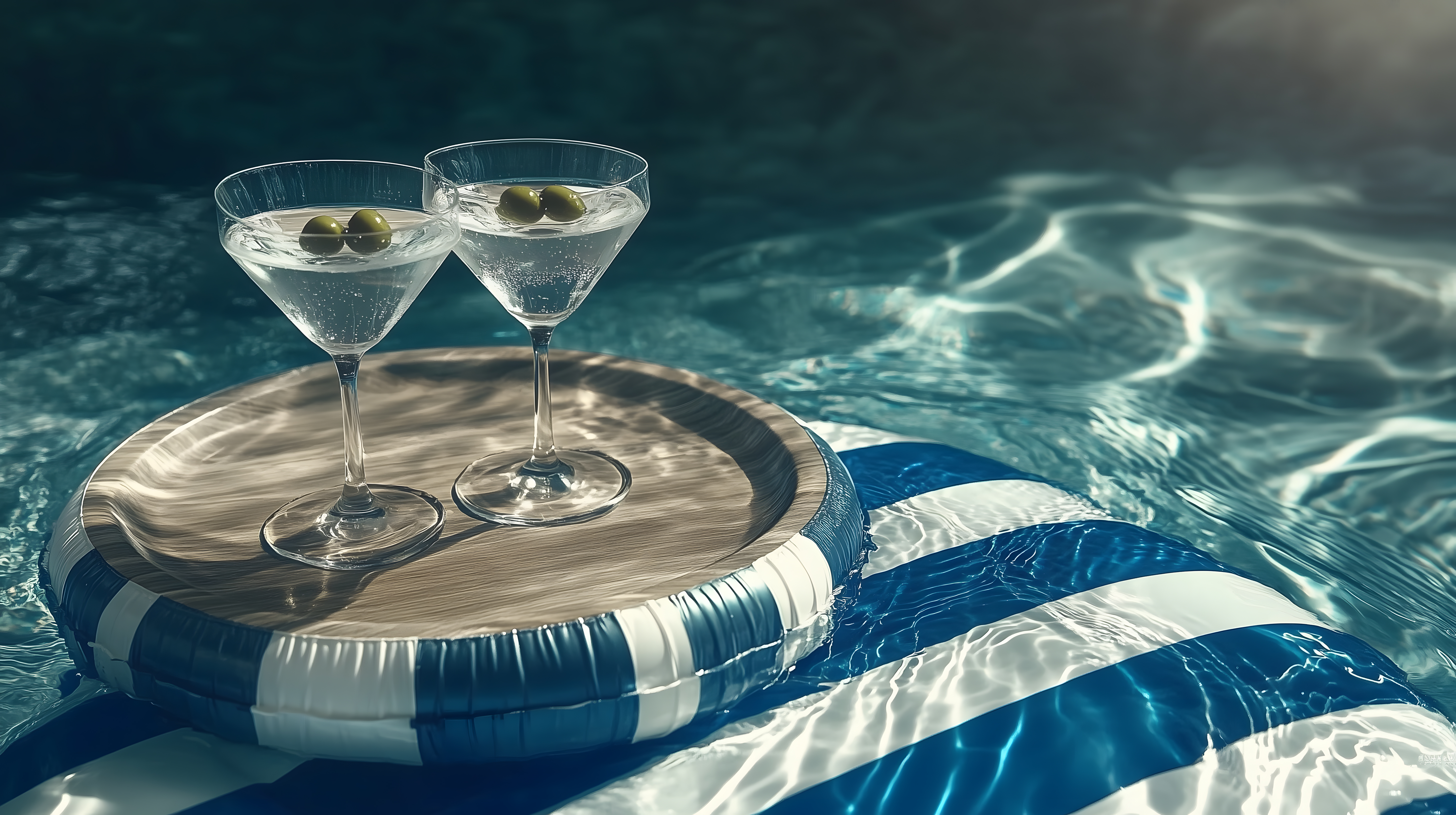 Dieses faszinierende Bild zeigt zwei elegant gestaltete Cocktailgläser auf einem schwimmenden Holztablett, eingebettet in die kristallklaren Gewässer eines Pools. Die leuchtenden Oliven in den Gläsern verleihen dem Arrangement einen stilvollen, einladenden Charakter. Die wunderschönen Lichtreflexionen im Wasser und die dunkle, mystische Stimmung des Hintergrunds schaffen eine entspannte, luxuriöse Atmosphäre. Dieses hochauflösende Stockfoto eignet sich hervorragend für den Einsatz in Blogs, Newslettern, Social-Media-Beiträgen oder Werbematerialien, die ein sommerliches, entspannendes Flair vermitteln möchten. Es steht unter einer Creative-Commons-Lizenz zur kostenlosen Verwendung zur Verfügung.