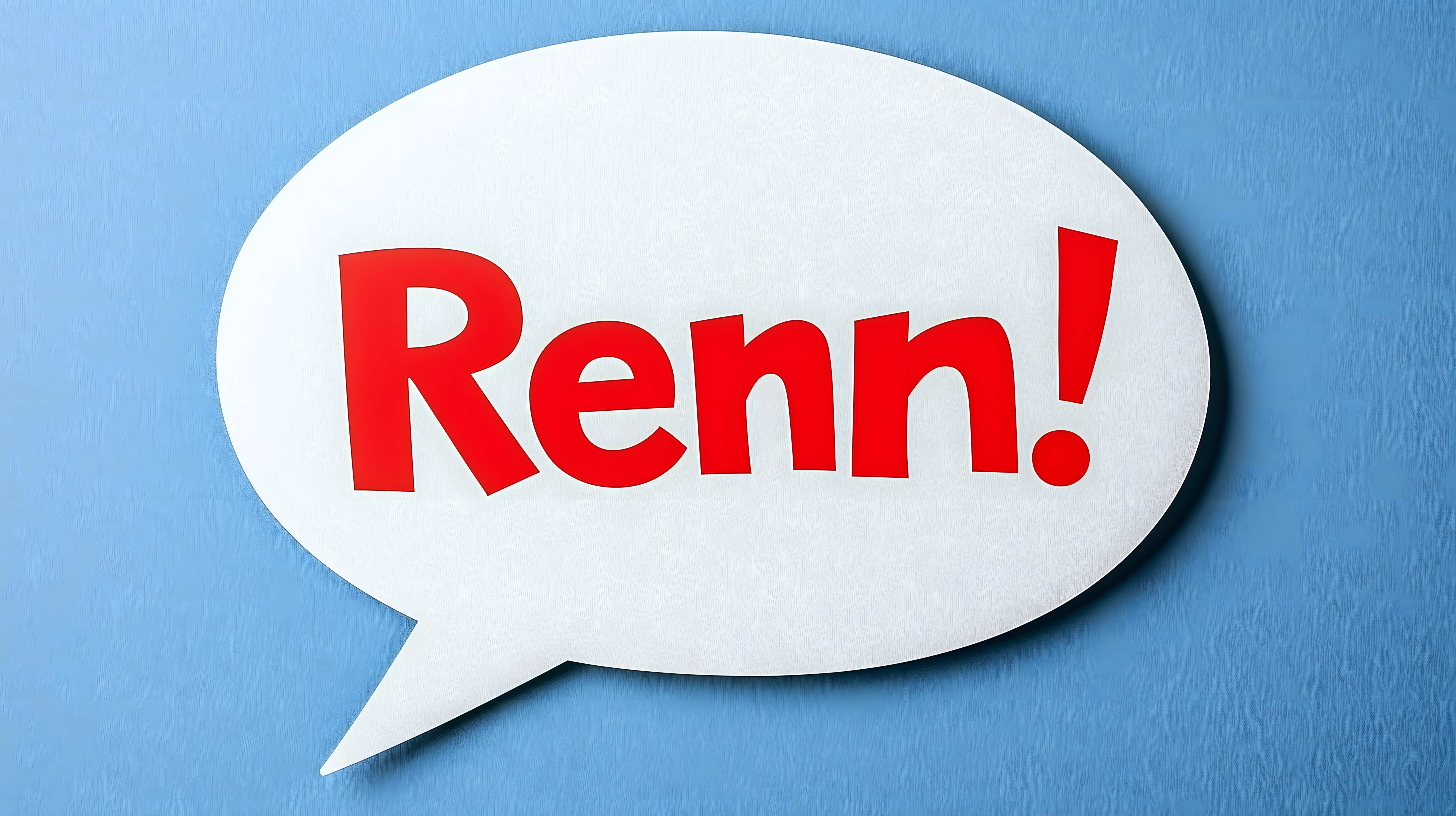 Dieses Stockfoto zeigt eine weiße ovale Sprechblase mit dem roten Wort 'Renn!' in der Mitte. Der minimalistisch gehaltene Hintergrund in einem hellen Blau lenkt den Fokus ganz auf die klare Botschaft der Blase. Das Bild kann vielfältig in Blogbeiträgen, Social-Media-Posts, Werbeanzeigen oder Newslettern eingesetzt werden, um Aufbruch, Motivation oder Dynamik zu vermitteln. Dieses hochauflösende Stockfoto ist unter einer Creative-Commons-Lizenz frei für den persönlichen und kommerziellen Gebrauch verfügbar.