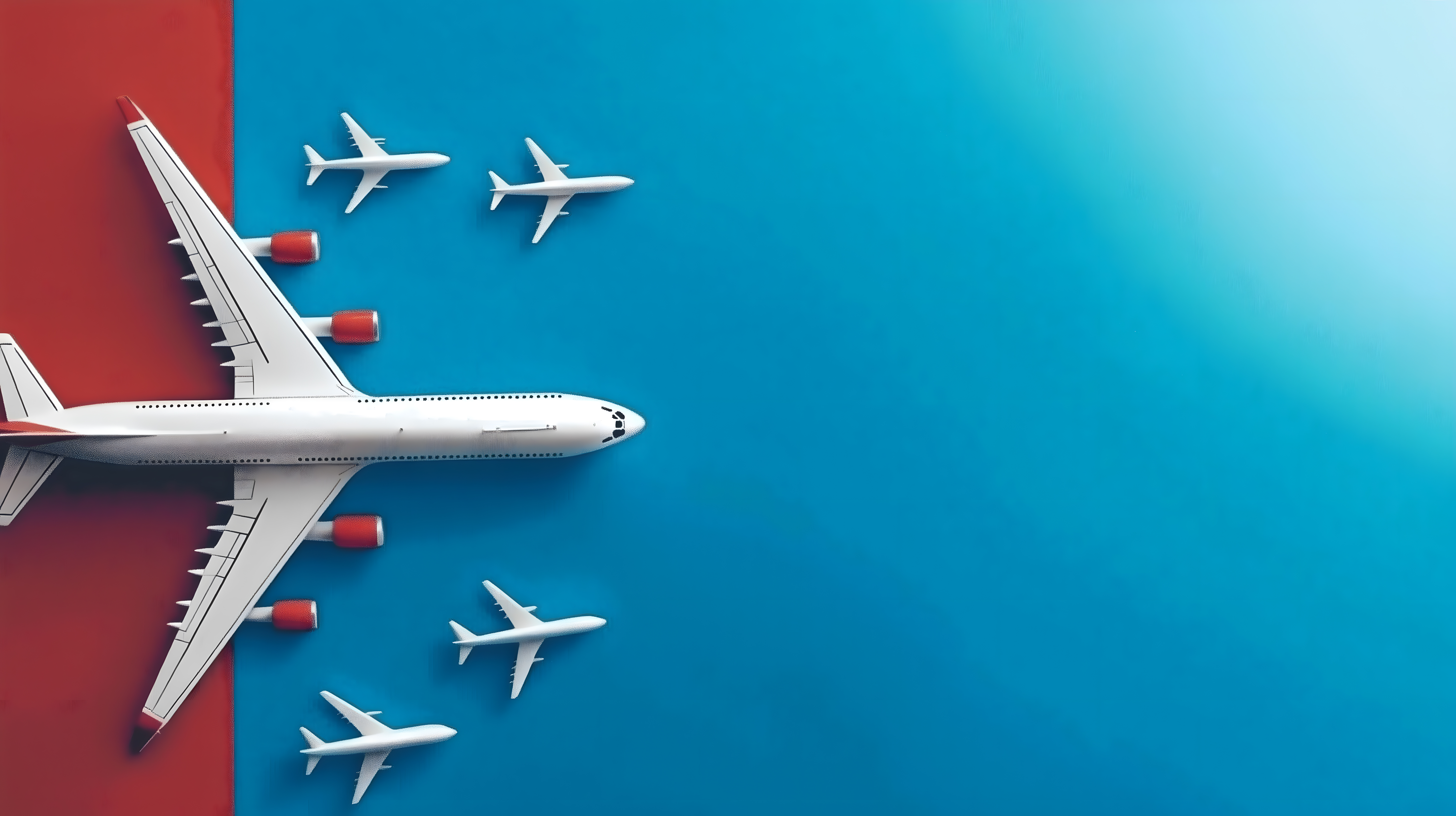 Das Bild zeigt eine kreative Komposition mit mehreren Flugzeugmodellen in Rot und Blau vor einem einfarbigen, türkisfarbenen Hintergrund. Die Flugzeuge sind in unterschiedlichen Größen und Ausrichtungen angeordnet, was dem Bild eine dynamische und interessante Optik verleiht. Die kontrastreichen Farben, die minimalistischen Formen und die freie Fläche um die Flugzeuge herum erzeugen eine moderne, stilvolle Ästhetik.