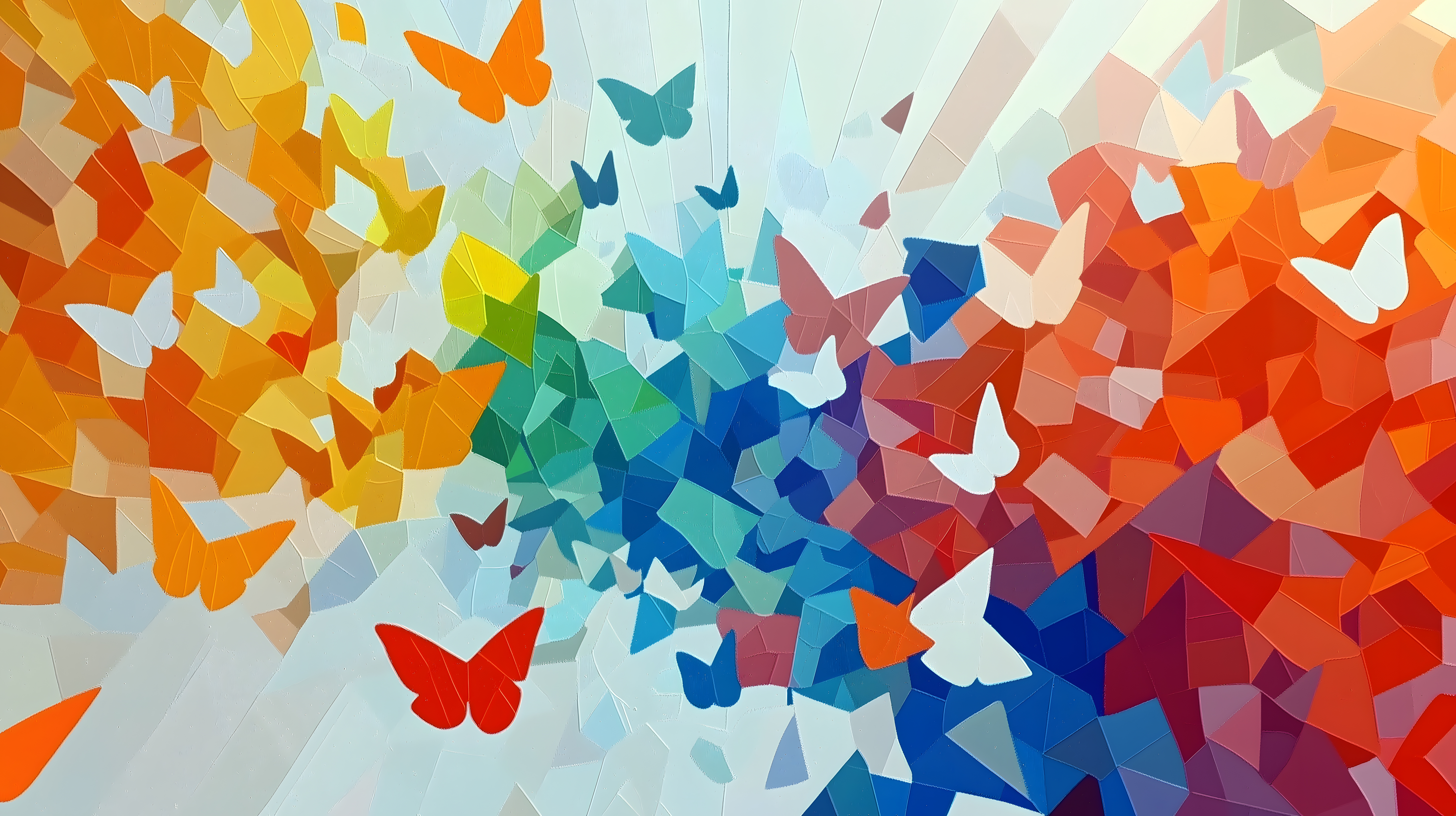 Dieses farbenfrohe Bild zeigt eine lebendige Collage aus Schmetterlingen in verschiedenen Größen und Farbtönen. Die Schmetterlinge bilden ein abstraktes, geometrisches Muster, das an Origami-Kunst erinnert. Die Farbpalette reicht von warmen Orangetönen über kräftiges Blau bis hin zu zarten Pastellnuancen, was dem Bild eine harmonische und fantasievolle Ausstrahlung verleiht.