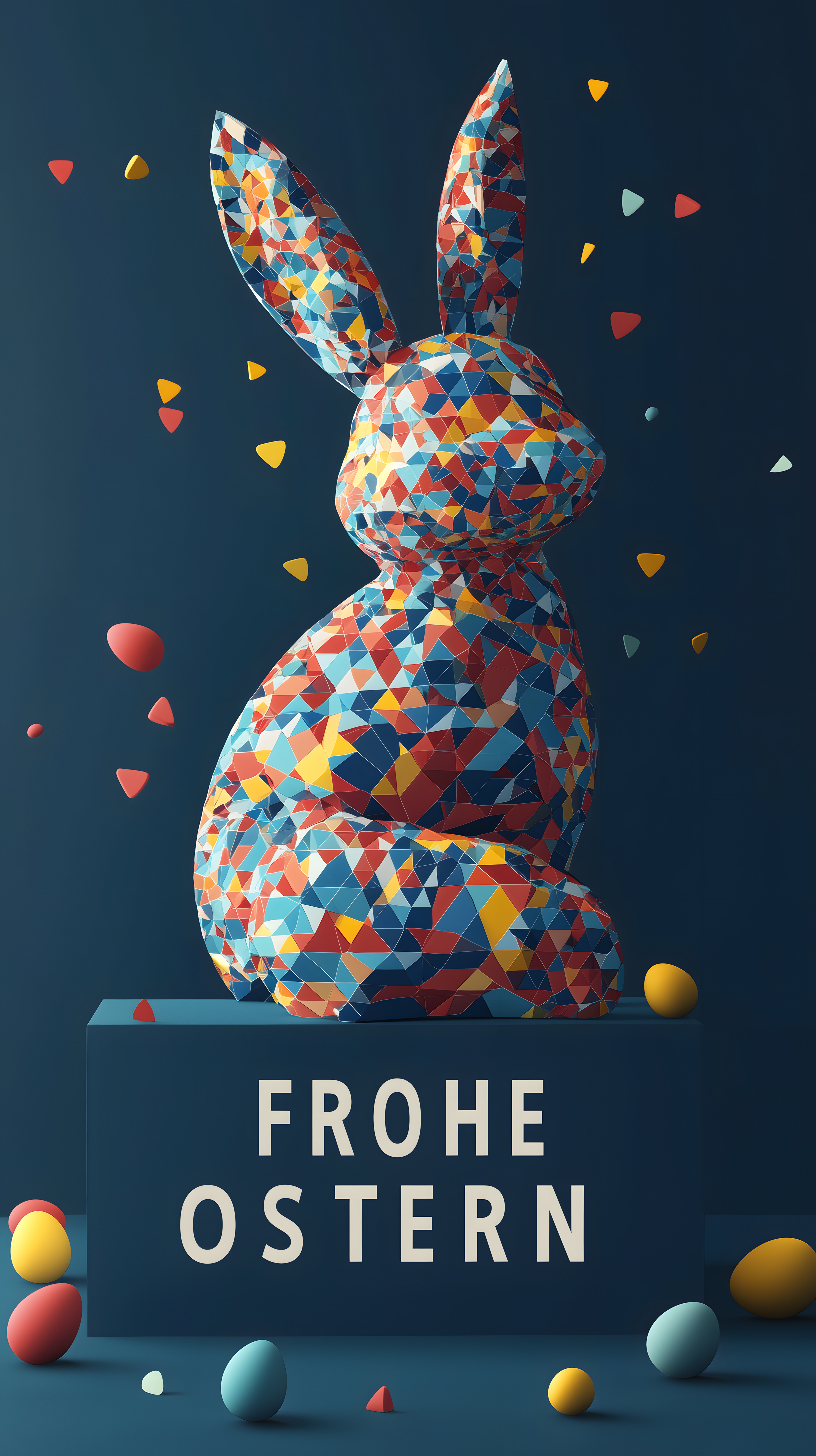Dieses Foto zeigt ein dekoratives Osterhäschen, das aus bunten, geometrischen Dreiecken zusammengesetzt ist. Der Hase hat eine 3D-Optik und sticht durch seine kräftigen, kontrastreichen Farben hervor. Die Komposition wirkt minimalistisch und grafisch, wodurch das Motiv eine moderne, stilisierte Anmutung erhält. Das Bild eignet sich hervorragend als Osterdeko, für Grußkarten oder andere Frühlingskampagnen. Als kostenloses Stockfoto in hoher Auflösung steht es unter der Creative Commons-Lizenz zur Verfügung.