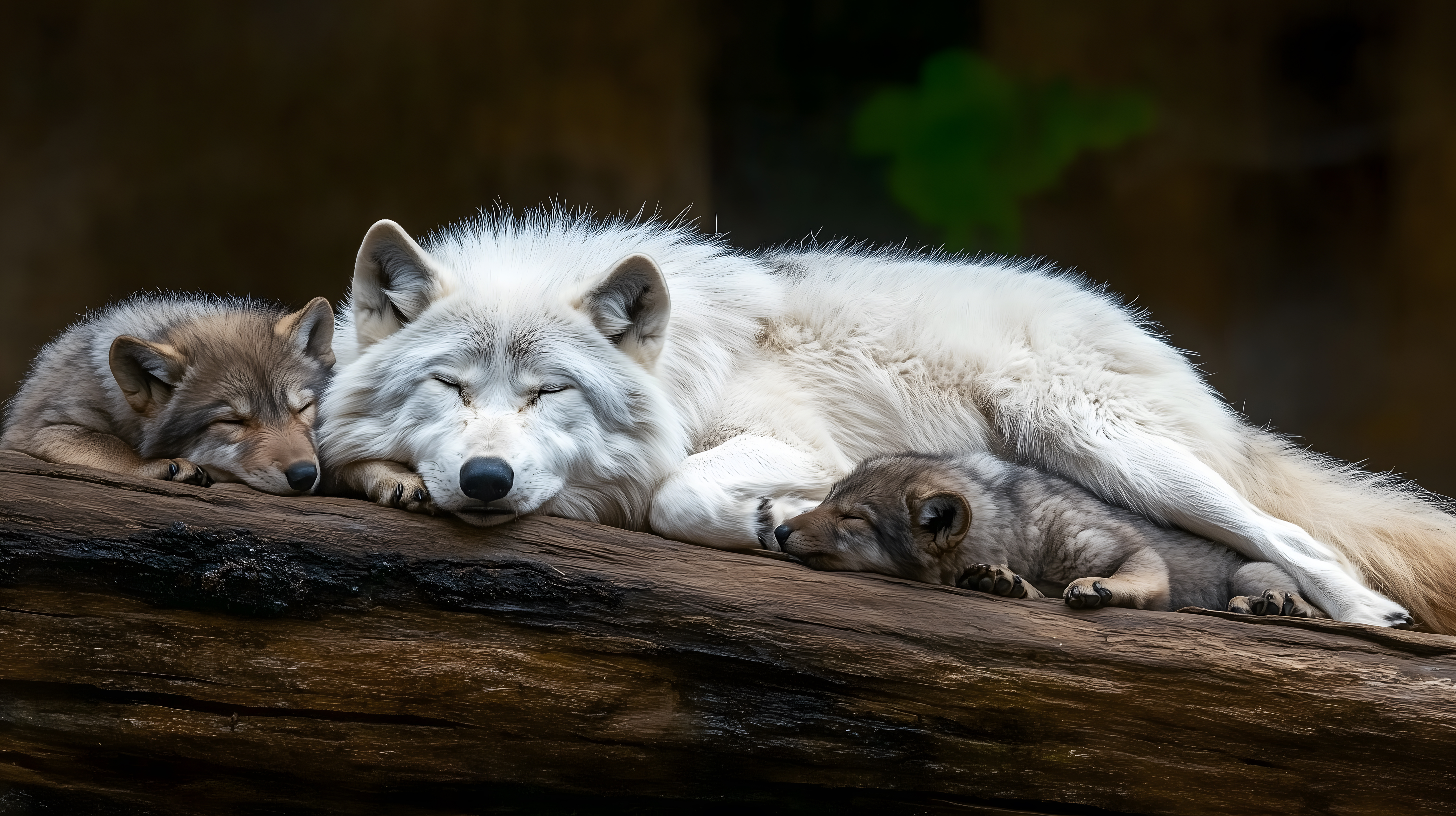 Dieses stimmungsvolle Bild zeigt eine Gruppe schlafender Wölfe auf einem Baumstamm inmitten einer natürlichen, waldigen Umgebung. Der große, weiße Wolf liegt friedlich mit seinen beiden Welpen auf dem Holz, ihre Fellfarben kontrastieren wunderschön mit dem dunklen Hintergrund. Die Szenerie strahlt eine ruhige, idyllische Atmosphäre aus und vermittelt einen Eindruck der Unberührtheit der Natur. Dieses hochwertige Stockfoto eignet sich hervorragend für Naturmotive, Tierfotografie oder Landschaftsmotive in Blogs, Newslettern, Social-Media-Posts oder Werbematerialien. Das Bild ist in hoher Auflösung und unter einer Creative-Commons-Lizenz kostenfrei verfügbar.