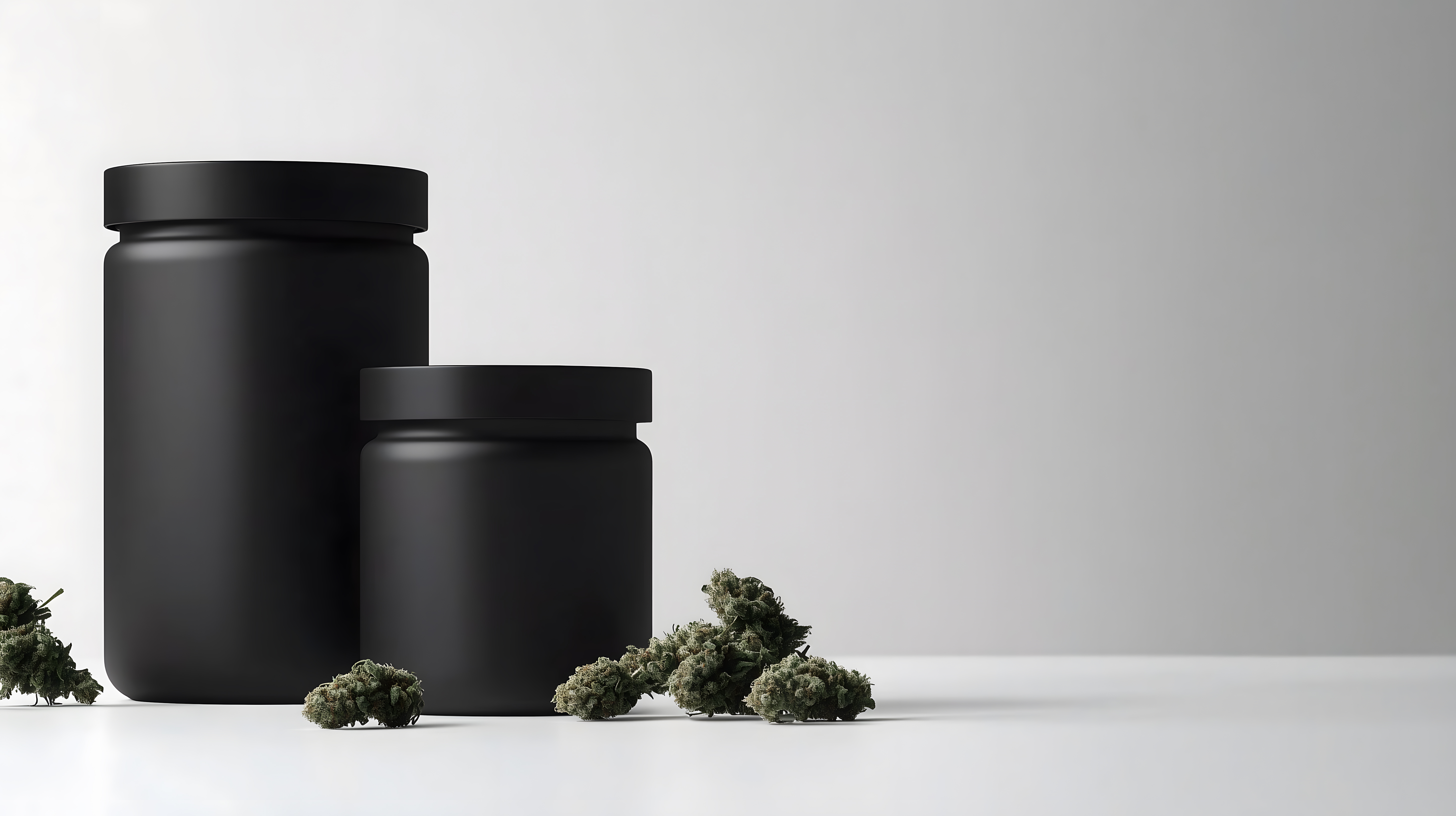 Das Foto zeigt zwei schwarze Gläser mit frischen, grünen Cannabis-Knospen auf einem weißen Hintergrund. Die Komposition ist sehr minimalistisch und fokussiert sich auf die Cannabisblüten als Hauptmotiv. Die Stimmung wirkt clean und hochwertig, was das Produkt in einem professionellen Licht erscheinen lässt. Dieses Stockfoto eignet sich hervorragend für Werbung, Blogs oder soziale Medien im Bereich der Naturheilkunde, Medizin oder des Lifestyles. Es ist in hoher Auflösung und unter einer Creative-Commons-Lizenz verfügbar.