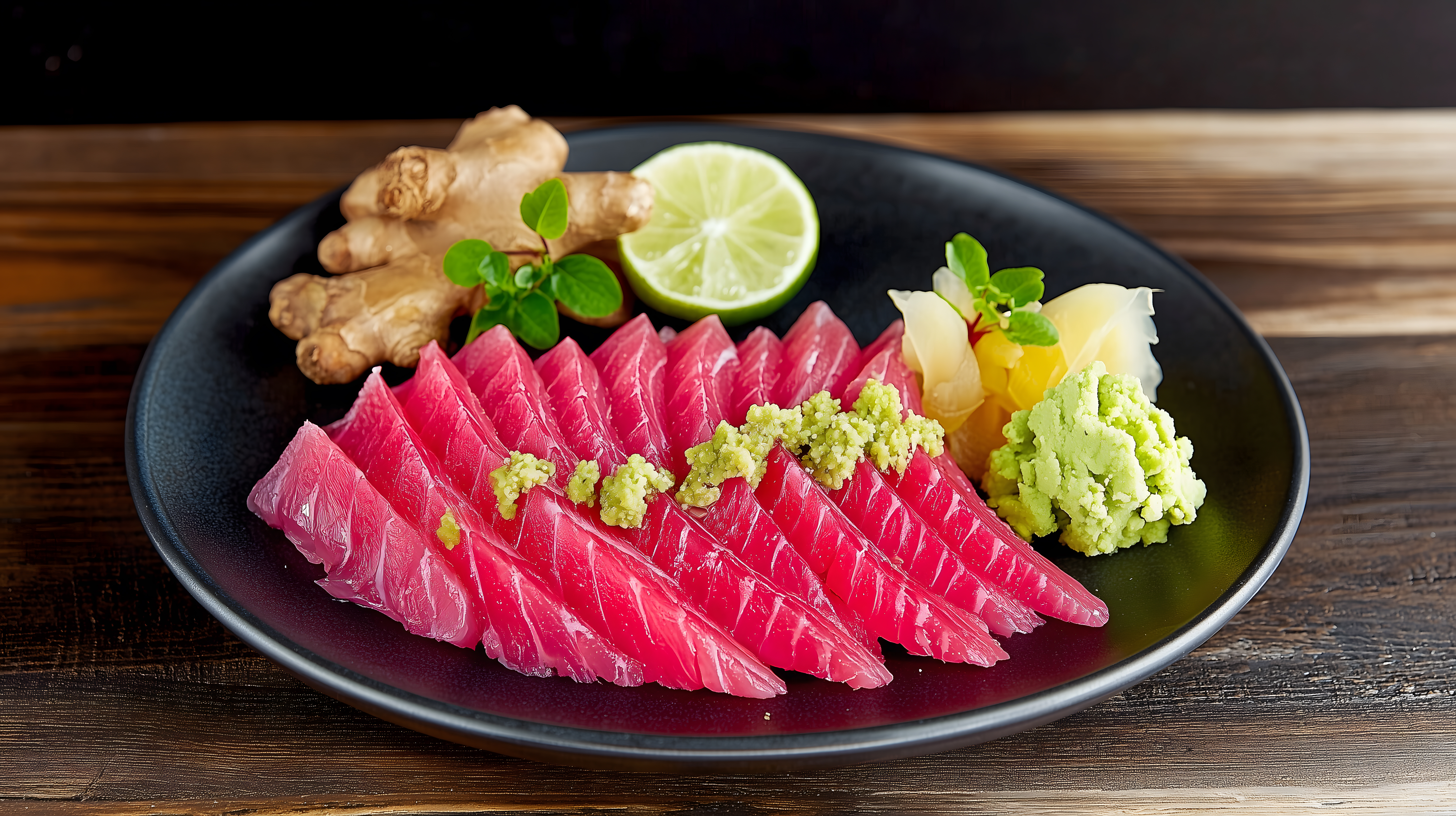 Dieses Foto zeigt ein appetitliches Gericht mit frisch geschnittenem Thunfisch-Sashimi, umgeben von Wasabi, Ingwer und einer Limettenscheibe. Das Sashimi ist in gleichmäßige Scheiben geschnitten und auf einem dunklen Teller angerichtet, der den Kontrast zu den leuchtend roten Fischstücken betont. Die Beilage aus Wasabi und Ingwer verleiht dem Gericht eine zusätzliche Würze und Schärfe, während die Zitrone eine erfrischende Note einbringt. Dieses Stockfoto in hoher Auflösung eignet sich hervorragend für die Verwendung in Blogbeiträgen, Newslettern oder Social-Media-Kanälen zu Themen wie gesunde Ernährung, japanische Küche oder exotische Gerichte. Es steht unter einer Creative-Commons-Lizenz zur Verfügung.