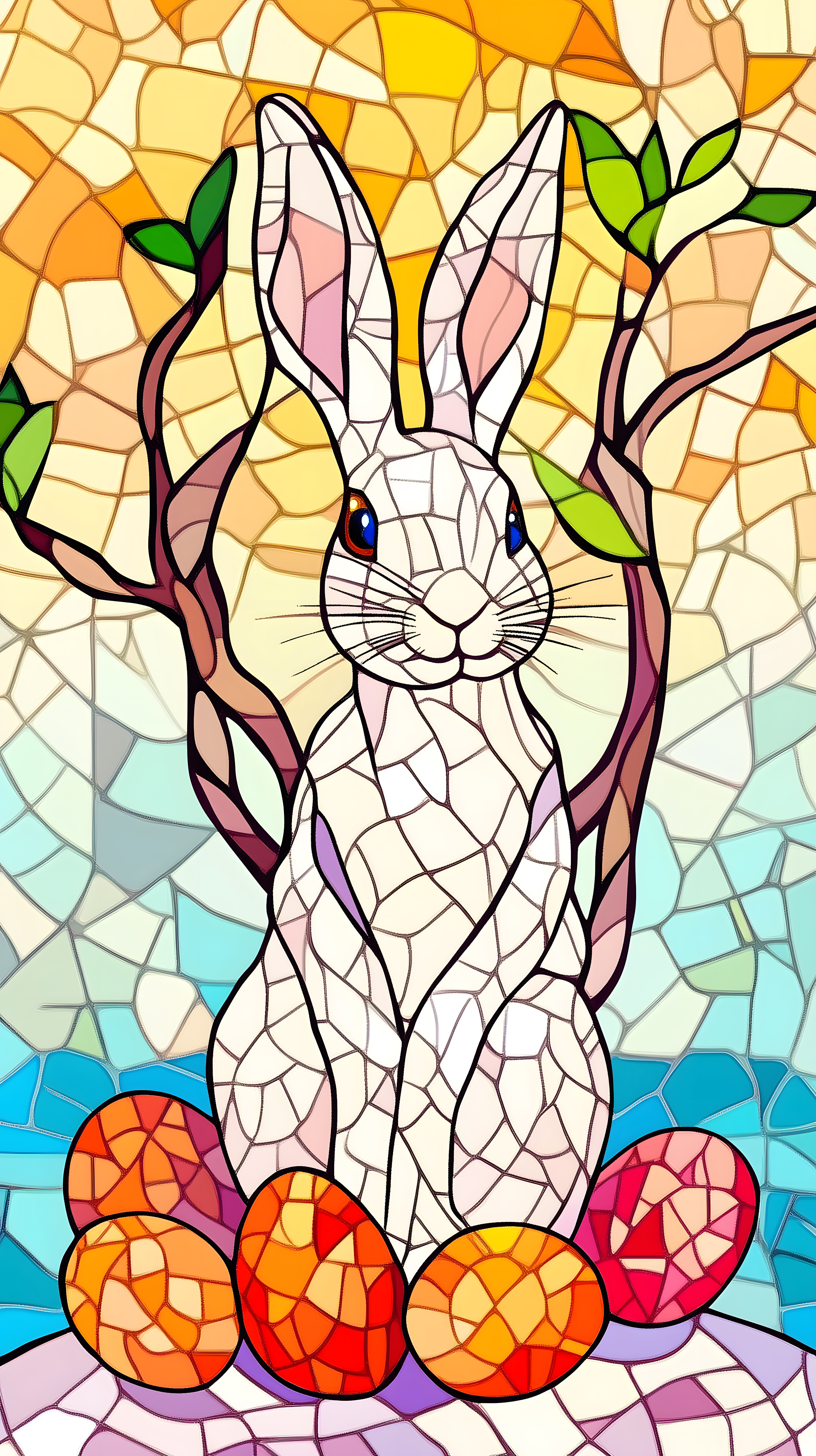 Dieses farbenprächtige Mosaik-Osterbild zeigt einen detailreichen Hasen umgeben von Ostereiern in einer stilvollen Glasmalerei-Optik. Der Hase ist im Vordergrund prominent platziert und hebt sich durch seine weißen Konturen und prägnanten Gesichtszüge deutlich von dem bunten, geometrischen Hintergrund ab. Die Eier in verschiedenen Farbtönen von Orange, Rot und Lila sind rund um den Hasen verteilt und fügen sich harmonisch in die Komposition ein. Insgesamt vermittelt das Bild eine festliche, frühlinghafte Stimmung, die sich ideal für den Einsatz in Oster-Dekorationen, Werbematerialien oder digitalen Medien wie Blogbeiträgen oder Social-Media-Posts eignet. Das hochauflösende, kostenlose Stockfoto steht unter einer Creative-Commons-Lizenz zur freien Verwendung zur Verfügung.