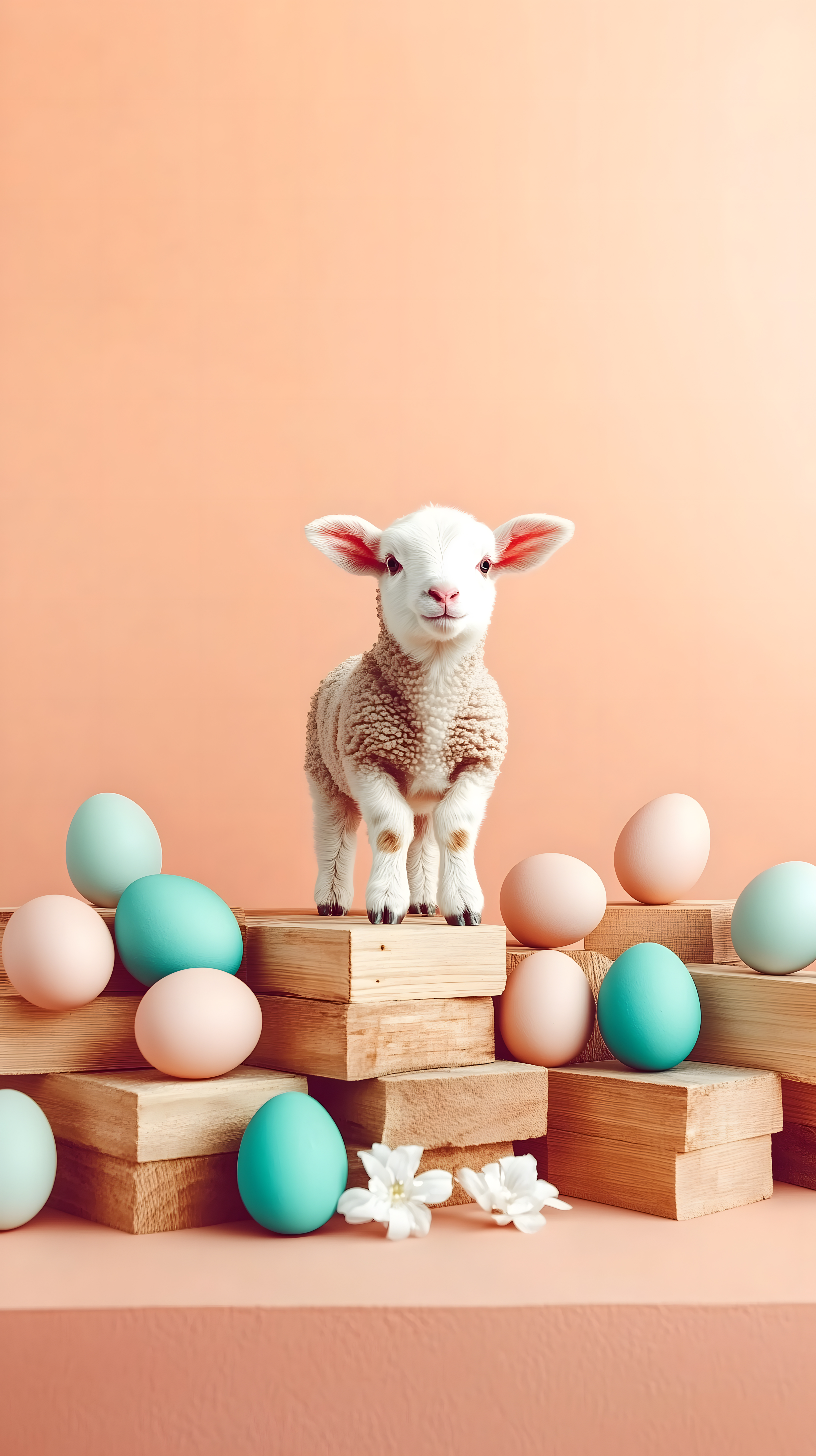 Das Foto zeigt ein süßes Osterlamm, das auf Holzkisten inmitten von bunten Ostereiern sitzt. Die Farbgebung ist pastellig und harmonisch, mit Tönen von Pfirsich und Minze. Das Bild strahlt Freude und Leichtigkeit aus und wäre perfekt für Ostergrüße, Blogbeiträge oder Werbekampagnen rund um das Osterfest. Als kostenloses Stockfoto in hoher Auflösung und unter Creative-Commons-Lizenz kann es frei verwendet werden.