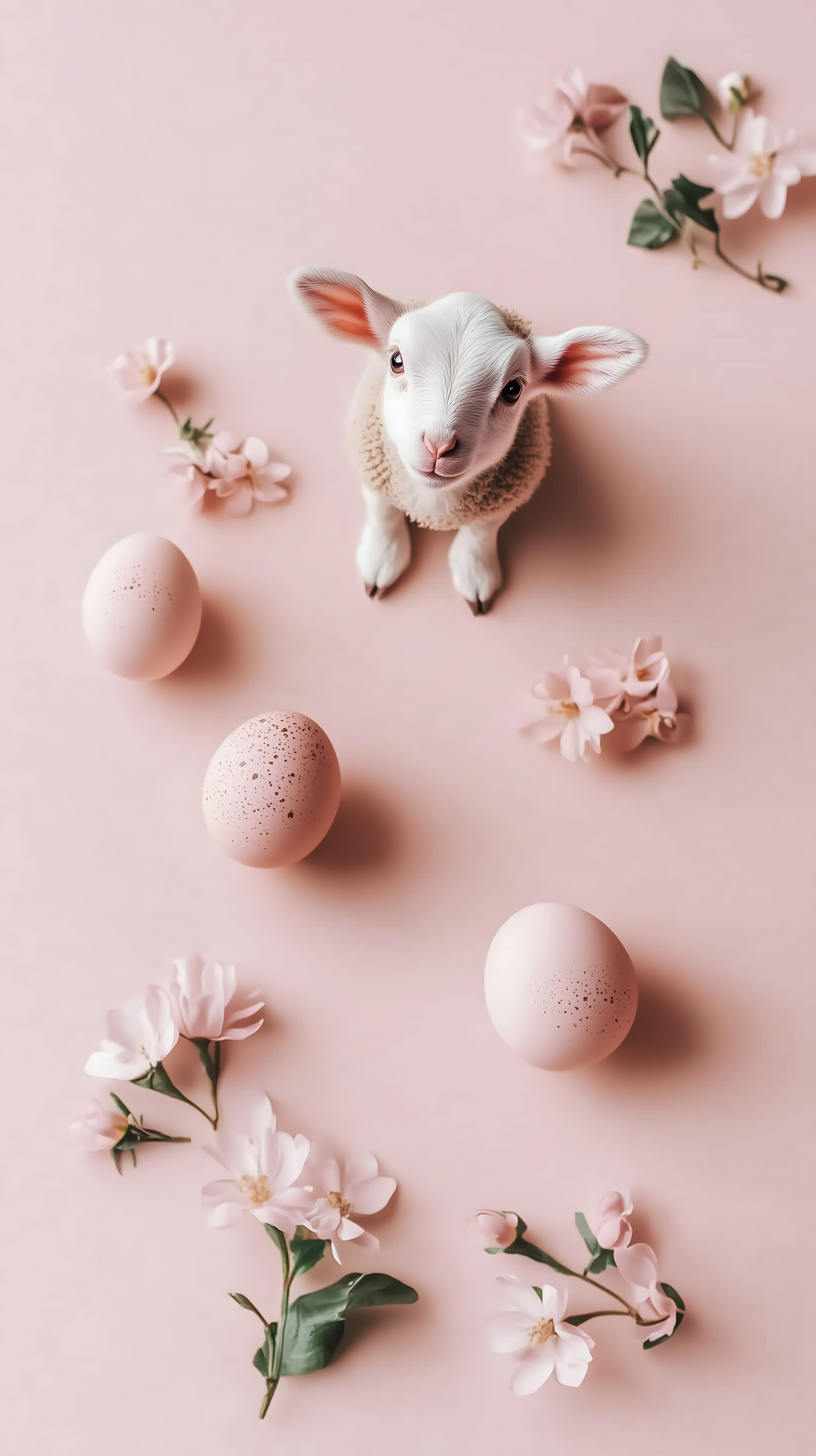 Dieses zarte, pastellfarbene Foto zeigt ein niedliches, weißes Lämmlein umgeben von Ostereiern und zarten Kirschblüten auf einem rosa Hintergrund. Die Komposition wirkt reduziert und minimalistisch, wodurch das Motiv im Fokus steht und eine friedliche, saisonale Stimmung vermittelt. Das hochauflösende Bild eignet sich hervorragend als kostenloses Stockfoto für kreative Projekte wie Blogs, Newsletter, Social-Media-Beiträge oder Werbeanzeigen rund um Ostern und den Frühling.