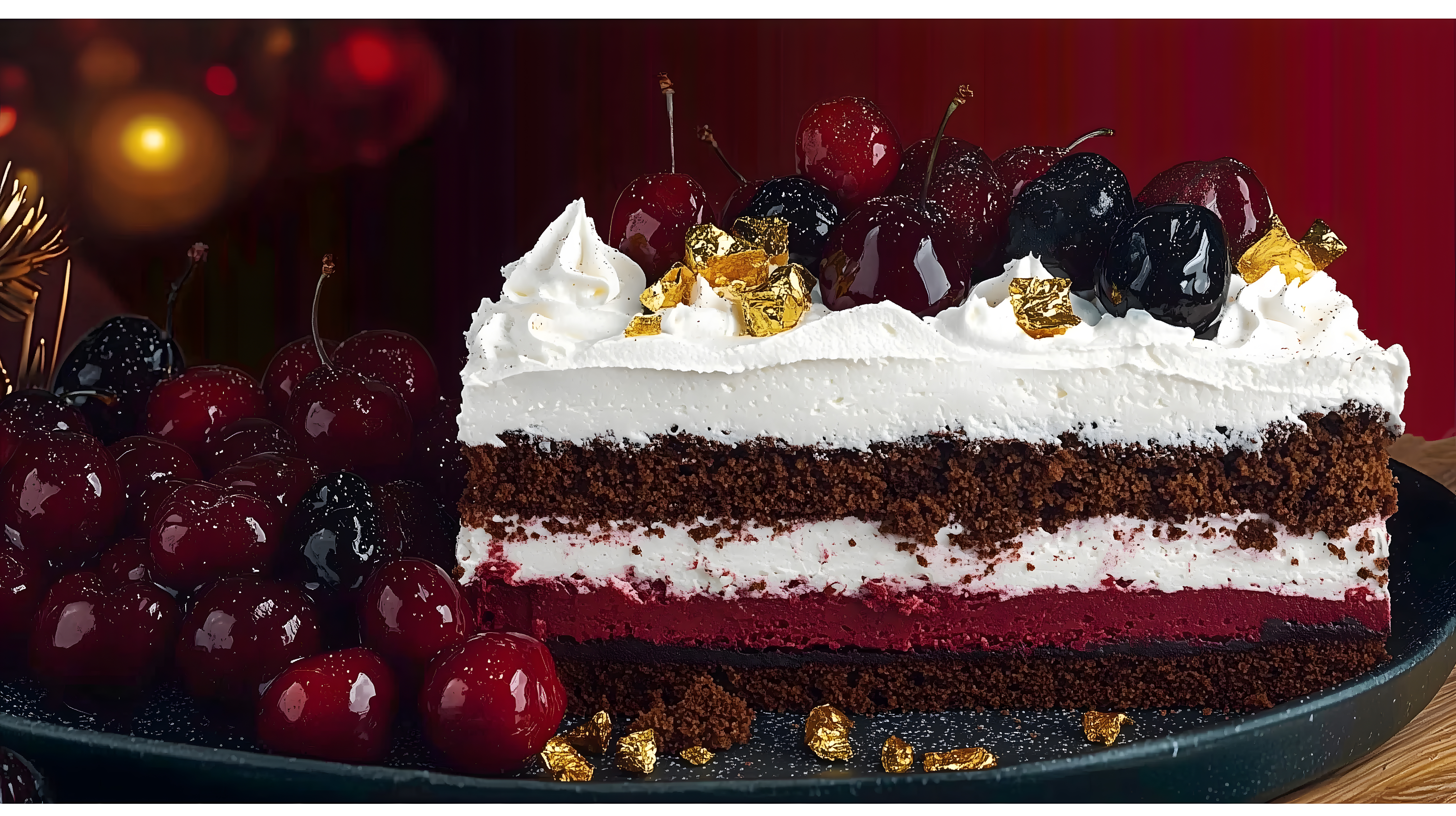 Dieses Foto zeigt eine prächtige Schwarzwälder Kirschtorte, die mit vielen Kirschen, Sahne und goldenem Dekor verziert ist. Die Torte ist auf einem dunklen Teller angerichtet und von weiteren Kirschen umgeben, was dem Bild eine festliche und luxuriöse Ausstrahlung verleiht. Das Foto eignet sich hervorragend als Stockfoto für Beiträge zu Desserts, Gastronomie, Catering oder festlichen Anlässen. Die hochwertige Auflösung und der Creative-Commons-Lizenz machen dieses Bild zu einem wertvollen Asset für Blogger, Social-Media-Kanäle und Werbeanzeigen.