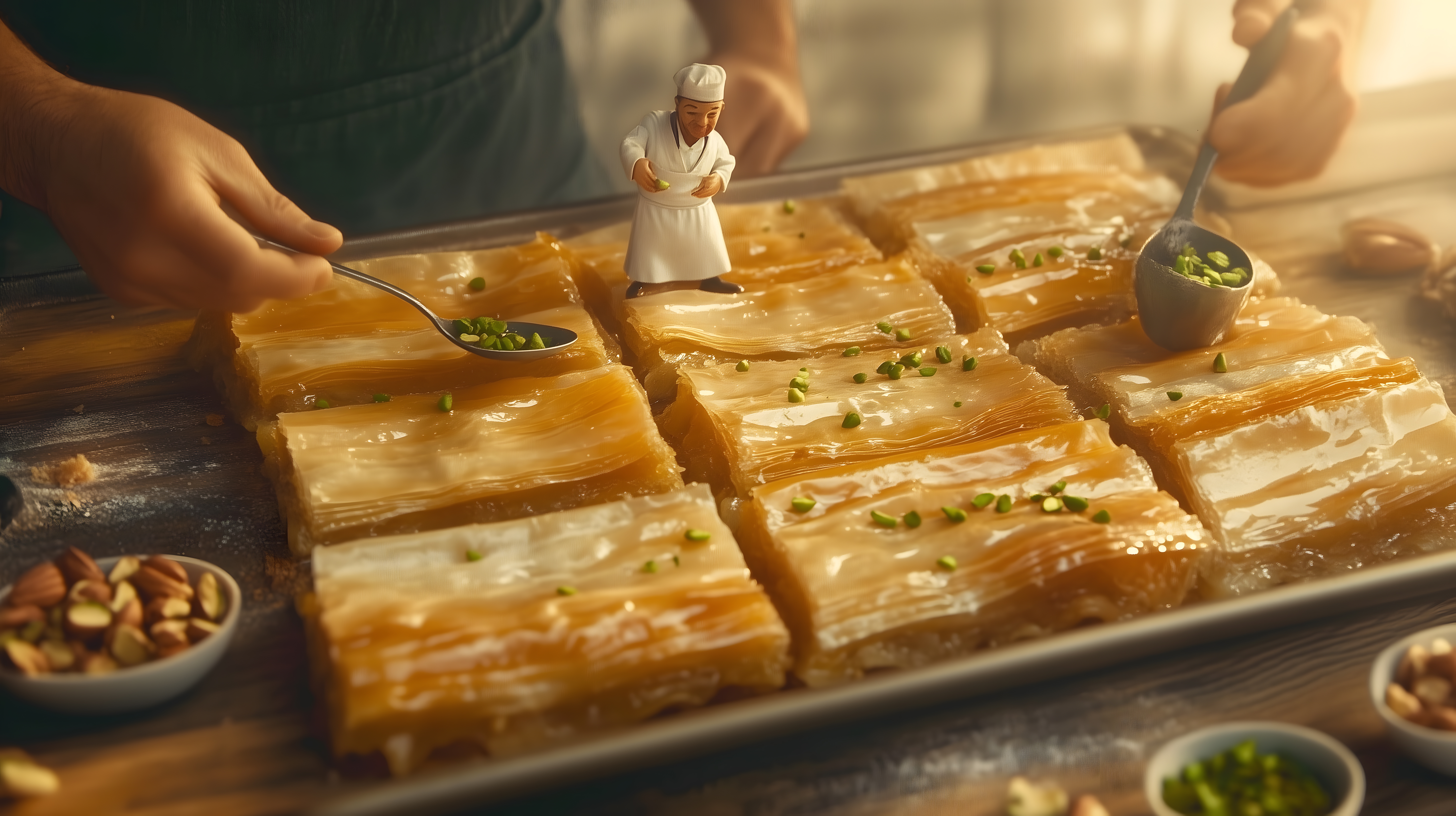 Das Foto zeigt eine Nahaufnahme von frisch gebackenem Baklava, einer traditionellen orientalischen Süßspeise aus Blätterteig, Nüssen und Honig. Die goldbraun gebackenen Stücke sind auf einem hölzernen Hintergrund angeordnet, der eine rustikale Textur aufweist. Einige der Stücke sind mit grünen Pistazienkernen garniert, was einen schönen Farbkontrast erzeugt. Die Ausleuchtung lässt das Baklava in einem warmen, natürlichen Licht erscheinen. Dieses hochwertige Stockfoto eignet sich hervorragend für die Verwendung in Blogs, Kochzeitschriften, Social-Media-Posts oder Werbematerialien rund um das Thema Backen, Desserts oder orientalische Küche. Das Foto ist in hoher Auflösung und unter einer kostenlosen Creative-Commons-Lizenz verfügbar.