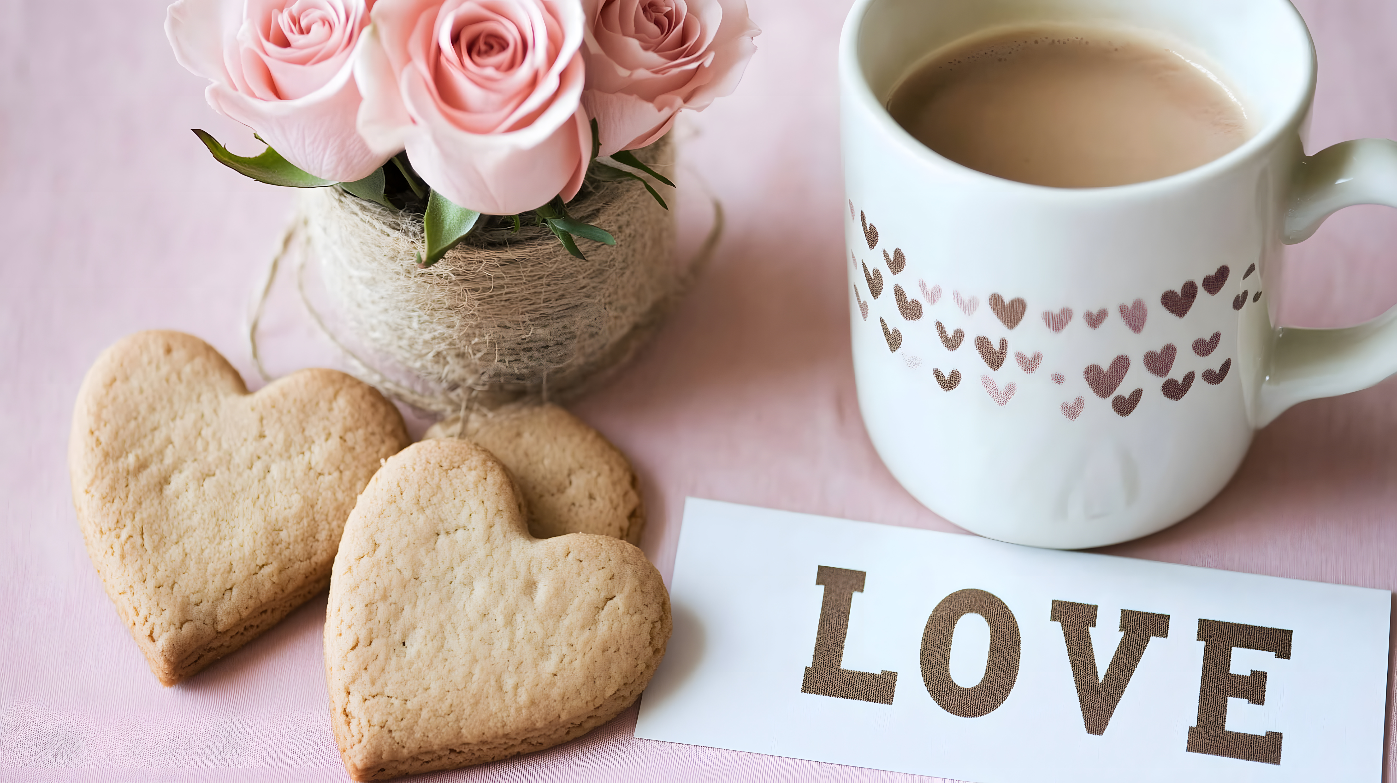 Dieses romantische Stockfoto zeigt ein stimmungsvolles Valentinstagsszenario. Im Mittelpunkt steht eine weiße Kaffeetasse mit Herzmotiv, umgeben von frischen rosa Rosen in einem Blumengesteck. Daneben liegen herzförmige Plätzchen auf einem rosa Untergrund, der zusätzlich ein Schild mit der Aufschrift 'LOVE' enthält. Die warmen Farbtöne, die gemütliche Komposition und die Symbolik der Liebe machen dieses Bild ideal für Valentinstags-Projekte wie Grußkarten, Blog-Beiträge oder Social-Media-Werbung. Das hochauflösende Foto ist als kostenloses Stockfoto unter einer Creative-Commons-Lizenz verfügbar.