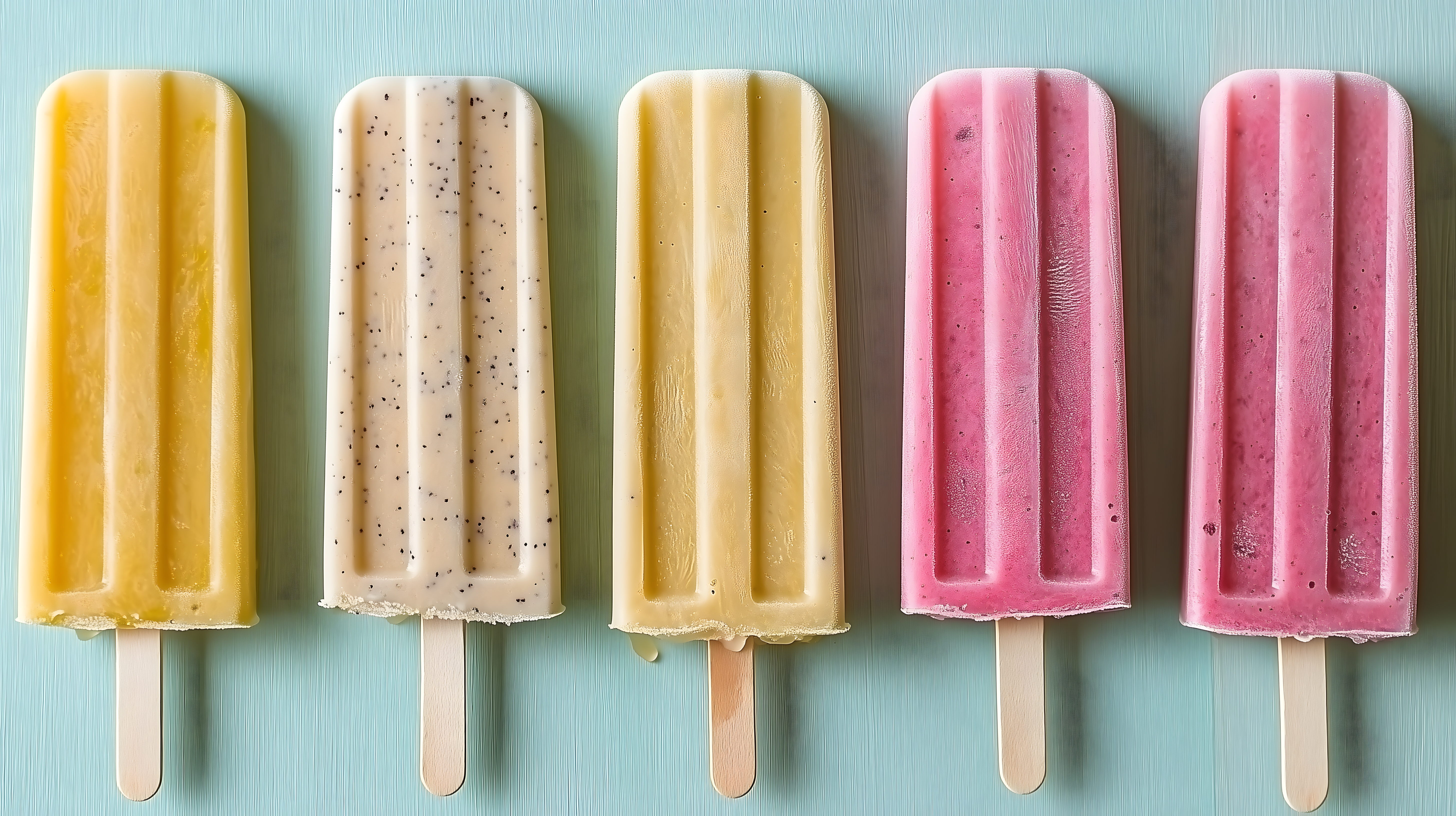 Dieses bunte, handgemachte Eis-am-Stiel-Foto zeigt eine Auswahl an leckeren Eiscreme-Kreationen in verschiedenen Geschmacksrichtungen und Pastellfarben. Die Eiswürfel sind in einer Reihe auf einem hellblauen Hintergrund flach angeordnet, sodass man ihre Strukturen und Texturen gut erkennen kann. Das Foto eignet sich hervorragend als kostenloses Stockfoto für Beiträge über Sommerleckerchen, Erfrischung und Desserts in hoher Auflösung unter Creative-Commons-Lizenz.