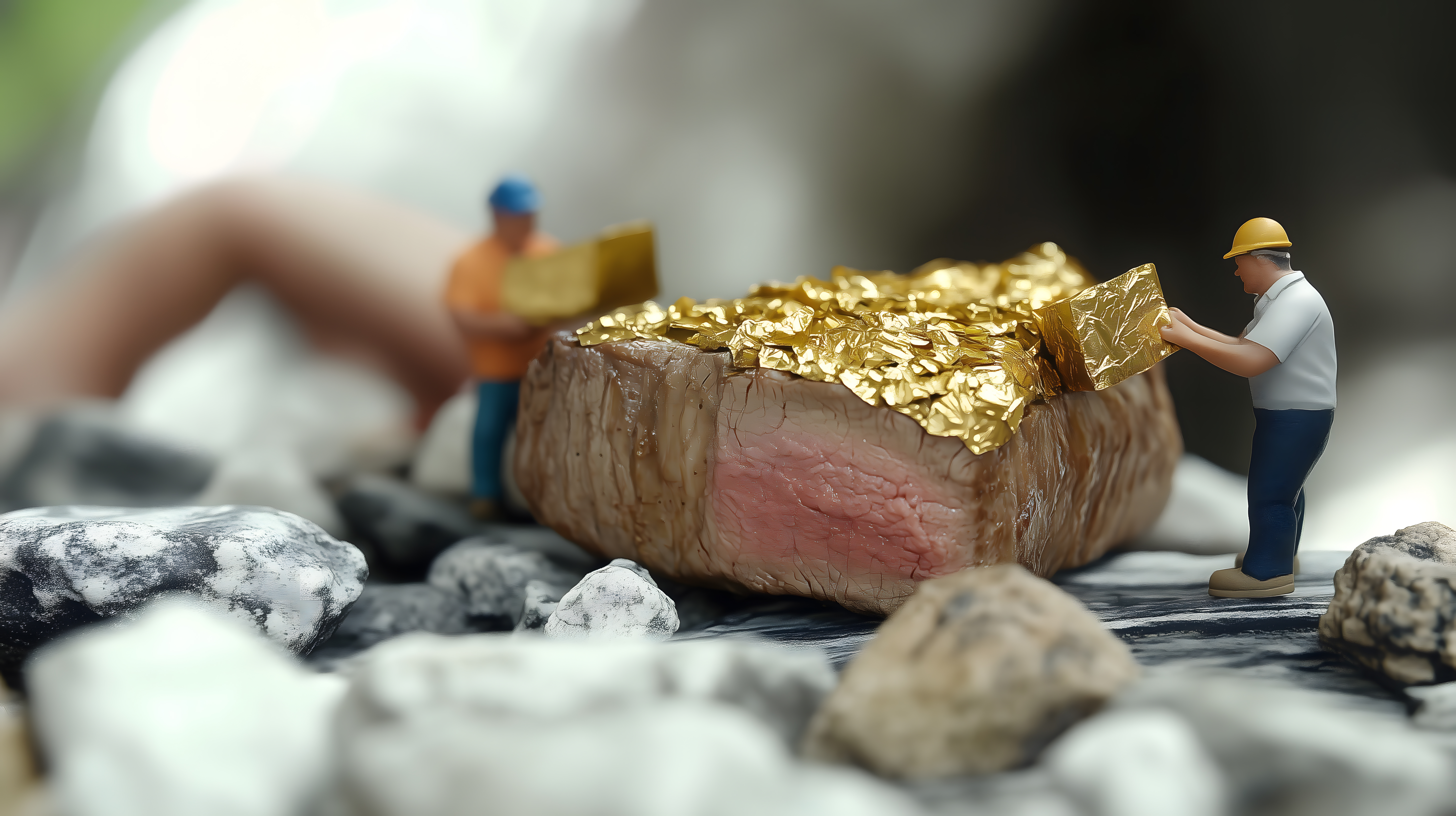 Das Bild zeigt einen Ausschnitt eines vergoldeten Steaks, das von Miniaturarbeitern bearbeitet wird. Der Kontrast zwischen dem luxuriösen Gold und den kleinen Figuren erzeugt einen fantasievollen, fast surrealen Eindruck. Die detailreiche Darstellung und die unerwartete Komposition machen dieses Bild zu einem echten Hingucker, das sich ideal für den Einsatz in Blogs, Newslettern oder Sozialen Medien eignet. Dieses kostenlose Stockfoto in hoher Auflösung steht unter einer Creative-Commons-Lizenz und kann frei genutzt werden.