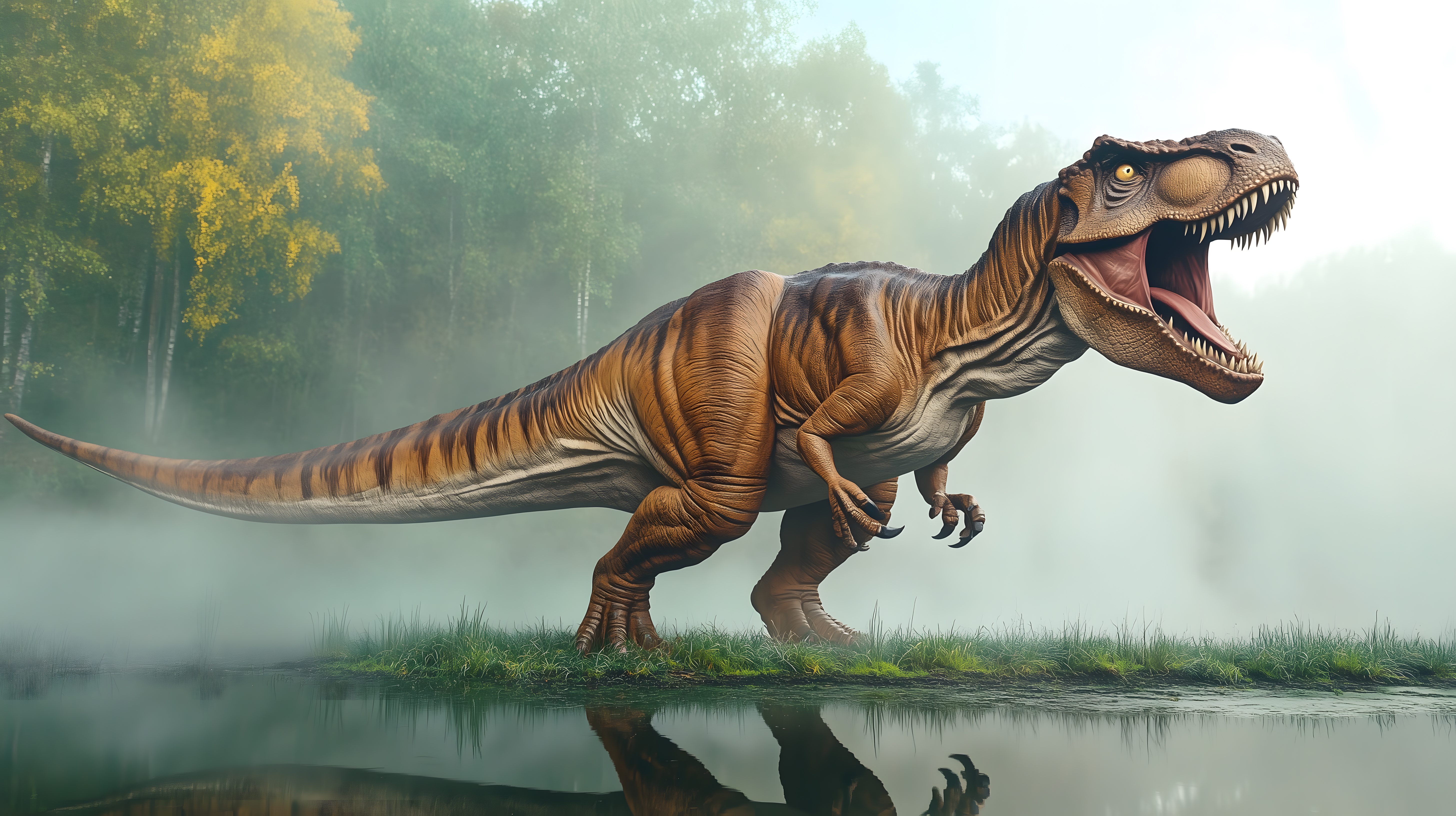 Dieses beeindruckende Stockfoto zeigt einen realistisch dargestellten Tyrannosaurus Rex in einer nebeligen Waldumgebung. Der mächtige Dinosaurier steht mit weit aufgerissenem Maul und bedrohlicher Körperhaltung im Vordergrund, seine riesige Silhouette spiegelt sich im ruhigen Gewässer wider. Die Szenerie ist in warmen Braun- und Grüntönen gehalten, die den prähistorischen Charakter unterstreichen. Dieses Foto eignet sich hervorragend für Verwendungen in Artikeln, Blogs oder Social-Media-Beiträgen zu Themen wie Dinosaurier, Paläontologie oder Naturwissenschaften. Als hochwertiges Stockfoto in hoher Auflösung und unter Creative-Commons-Lizenz kann es kostenlos und unkompliziert genutzt werden.