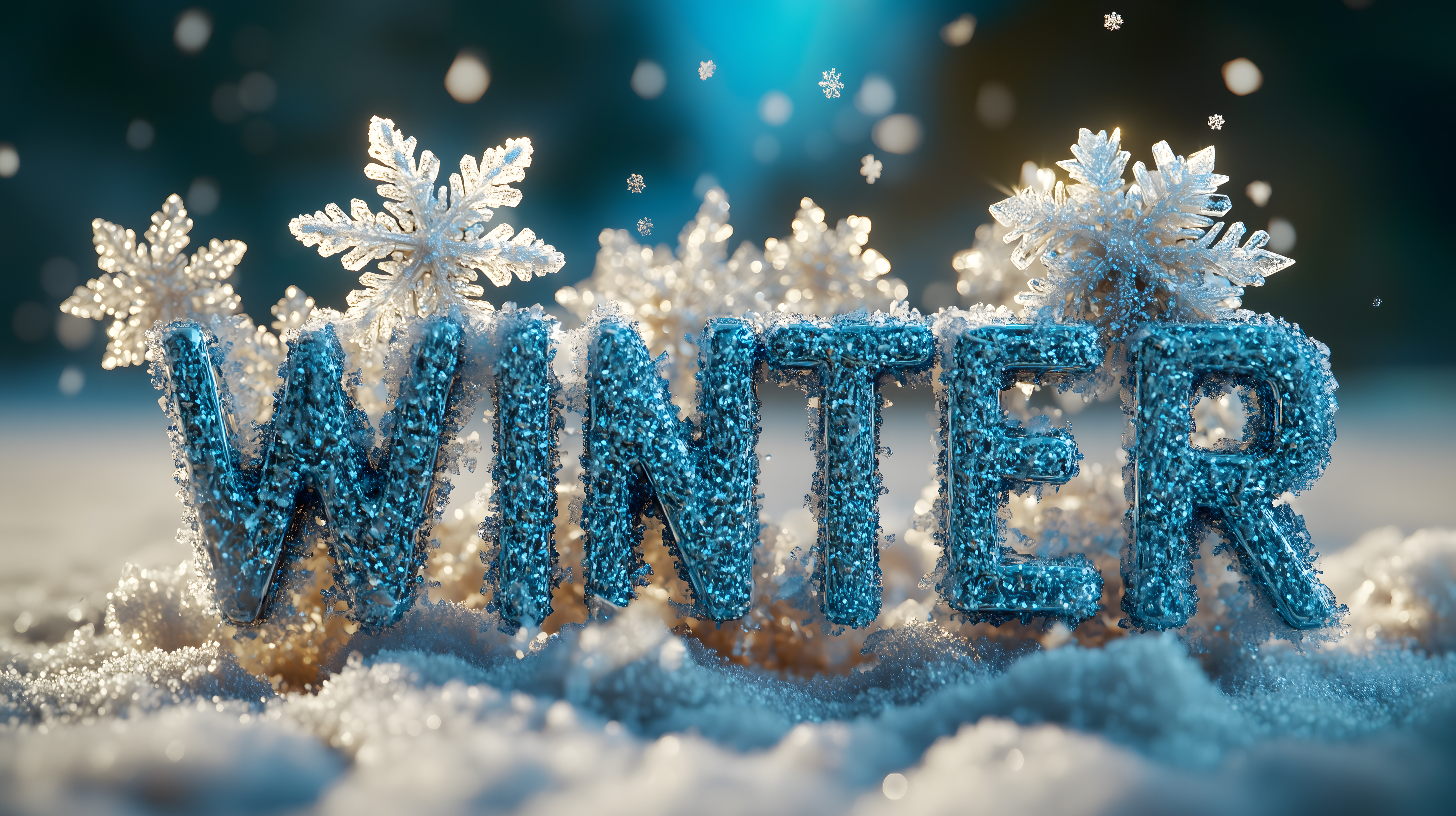 Dieses faszinierende Winterfoto zeigt eine wundervolle Szenerie mit glitzernden, kristallinen Schneeflocken und dem Schriftzug 'WINTER' in leuchtenden, türkisfarbenen Buchstaben, umrahmt von filigran geformten Eisblumen. Die Komposition, die warmen und kühlen Farbkontraste sowie die Unschärfe des Hintergrunds erzeugen eine stimmungsvolle, magische Atmosphäre. Dieses hochauflösende Stockfoto in Creative-Commons-Lizenz eignet sich perfekt für Winterdekorationen, Weihnachtsgrüße, Blogbeiträge oder Werbekampagnen, die eine eisige, aber gleichzeitig wohlige Stimmung vermitteln wollen.