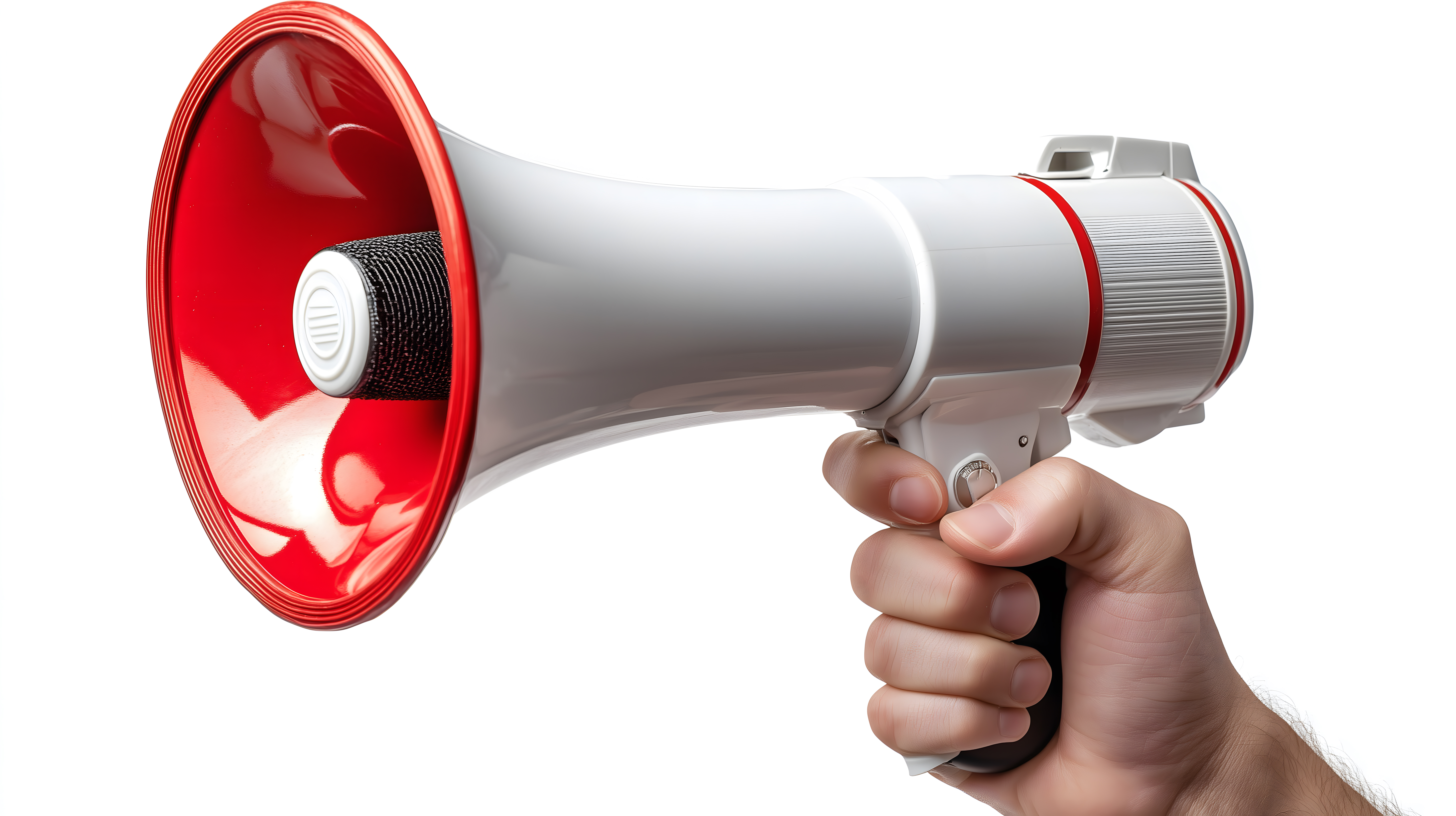 Das Bild zeigt ein rotes, kunststoffartiges Megaphon, das von einer Hand gehalten wird. Vor einem weißen Hintergrund ist das Megaphon in der Mitte des Bildes zentriert und im Fokus. Die Handposition und das Design des Megaphons lassen vermuten, dass es sich um eine Produktfotografie handelt, die möglicherweise für Marketingzwecke, Werbung oder Ankündigungen verwendet werden könnte. Das Foto bietet eine saubere, minimale Ästhetik und ist ideal für den Einsatz in Blogs, Newslettern, Social-Media-Beiträgen oder als hochwertiges Stockfoto für kommerzielle Projekte. Die Datei ist in hoher Auflösung und unter einer Creative-Commons-Lizenz verfügbar.