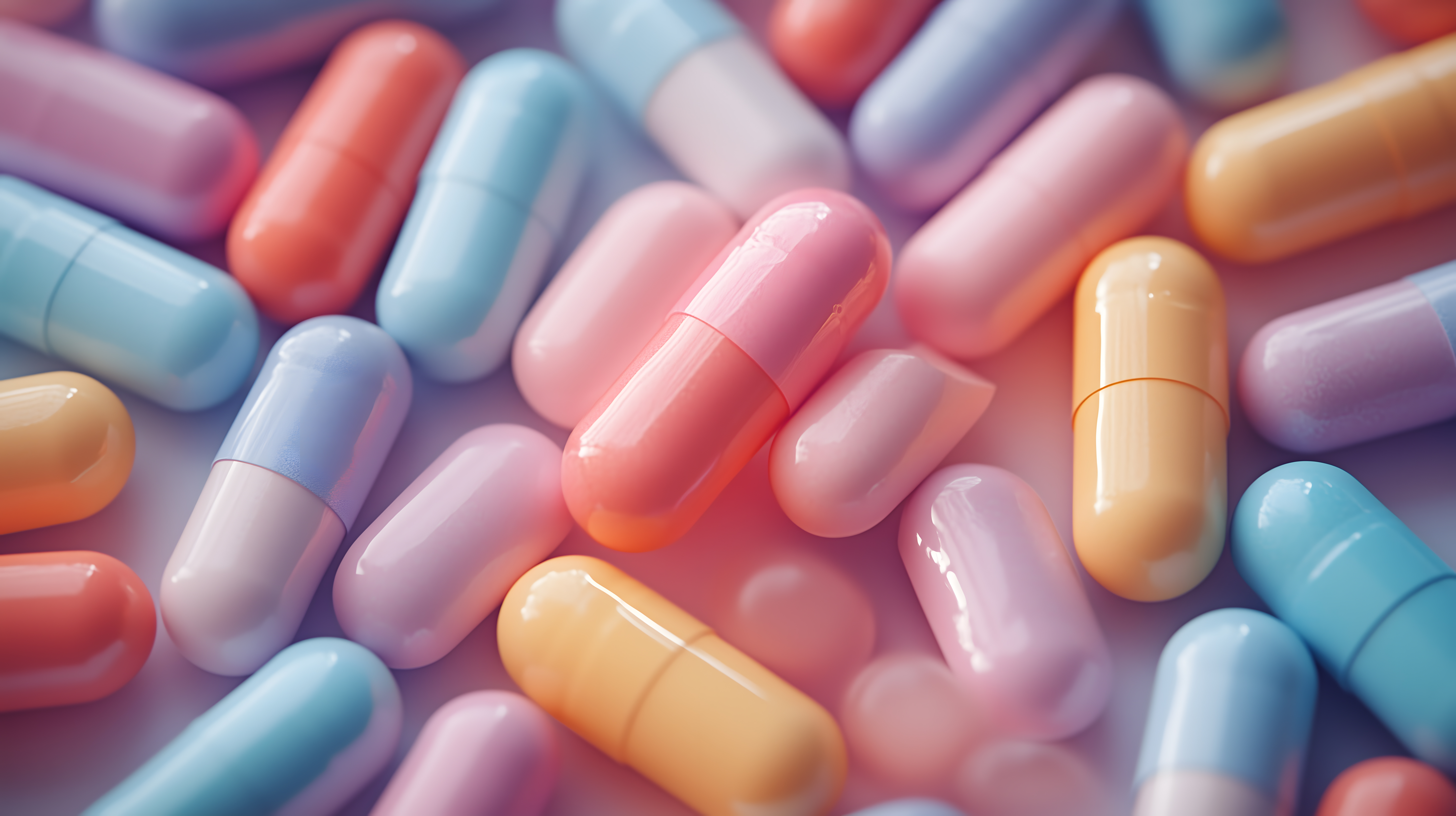 Dieses farbenfrohe Foto zeigt eine Vielzahl von medizinischen Kapseln und Pillen in pastelligen Farben. Die Perspektive ist eine Draufsicht, was den Fokus auf die Details und Texturen der Präparate lenkt. Die Anordnung der Objekte ist gleichmäßig und symmetrisch, was eine ruhige und harmonische Komposition ergibt.