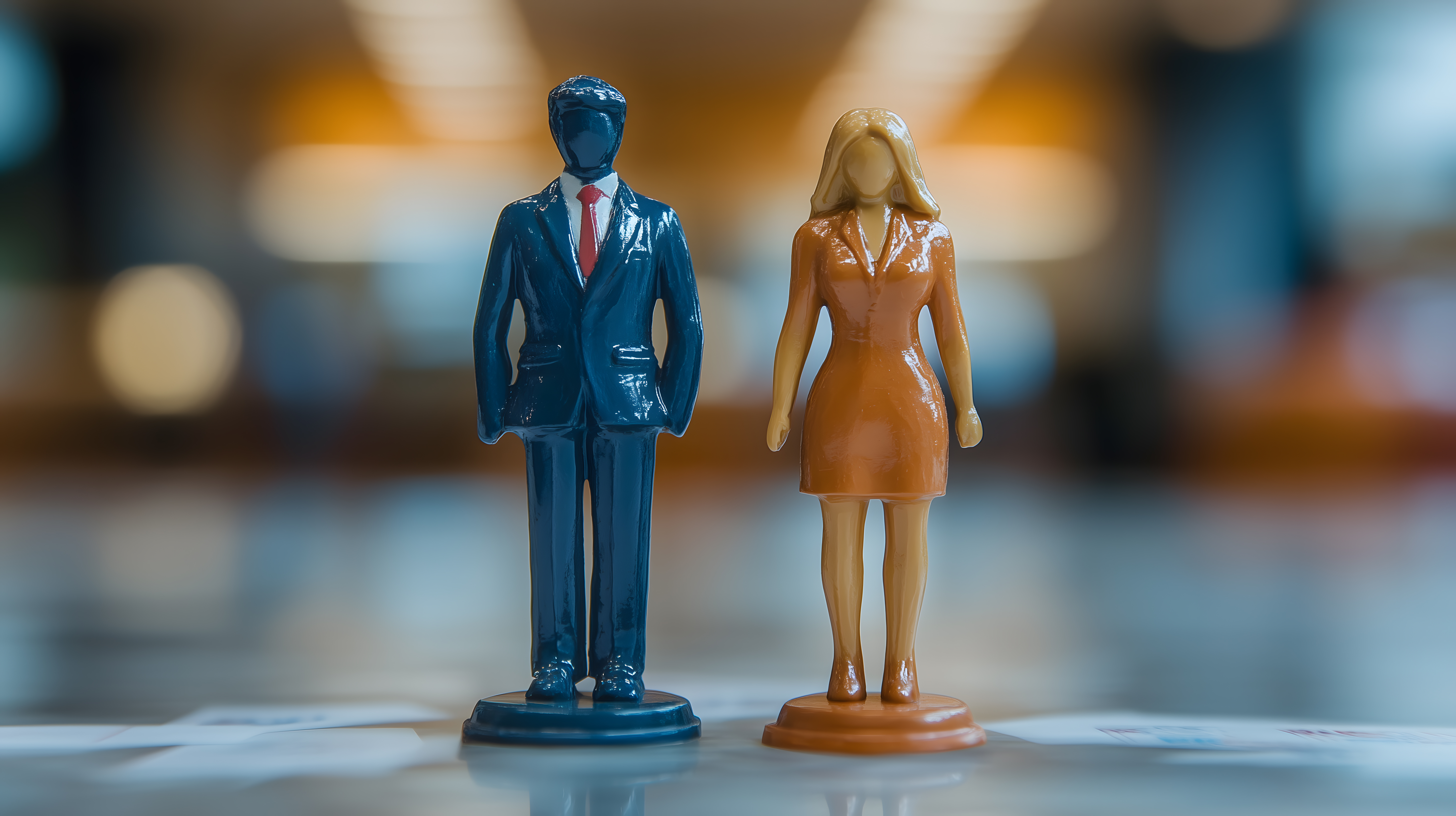 Das Bild zeigt zwei Plastikfiguren - einen Mann in Anzug und eine Frau in Kostüm. Sie stehen nebeneinander und symbolisieren die Gleichberechtigung und den Abbau des Gender Pay Gap in der Arbeitswelt. Das Bild kann für Themen wie Geschlechtergleichstellung, Diversität im Unternehmen oder Teamarbeit verwendet werden. Mit der unscharfen Hintergrundbeleuchtung wirkt es modern und hochwertig. Als kostenloses Stockfoto in hoher Auflösung und unter Creative-Commons-Lizenz ist es ideal für Blogs, Websites, Newsletter oder Werbematerial.
