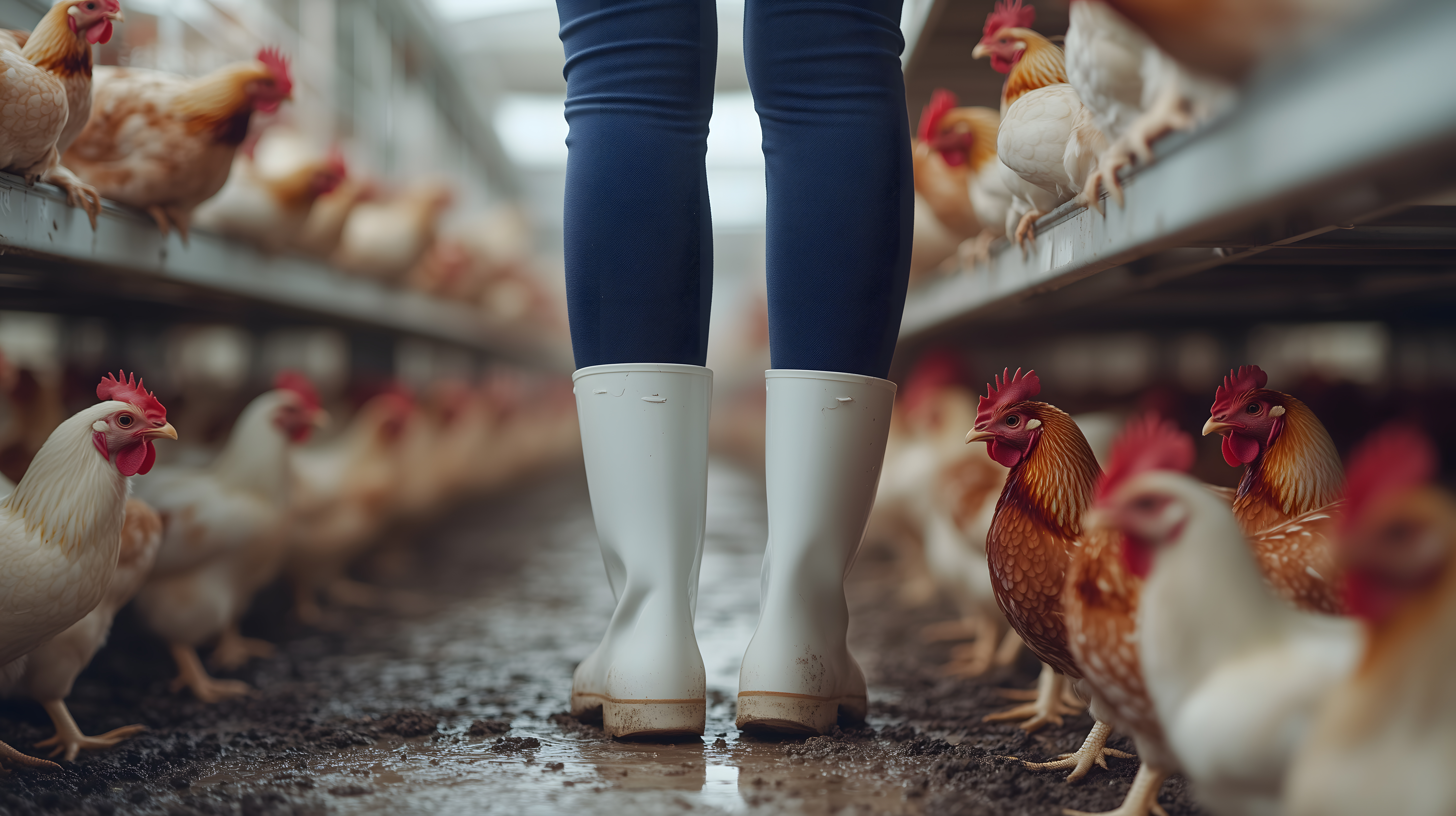 Das Bild zeigt eine Landarbeiterin, die mit Gummistiefeln in einem Hühnerstall steht. Im Vordergrund sind mehrere freilaufende Hühner zu sehen, die auf einem erdigen Boden umherlaufen. Der Stall ist einfach gehalten, mit Regalen oder Käfigen an den Wänden. Das Bild vermittelt den Eindruck einer typischen Szene aus einem Hühnerstall auf einem Bauernhof oder einer Hühnerfarm.