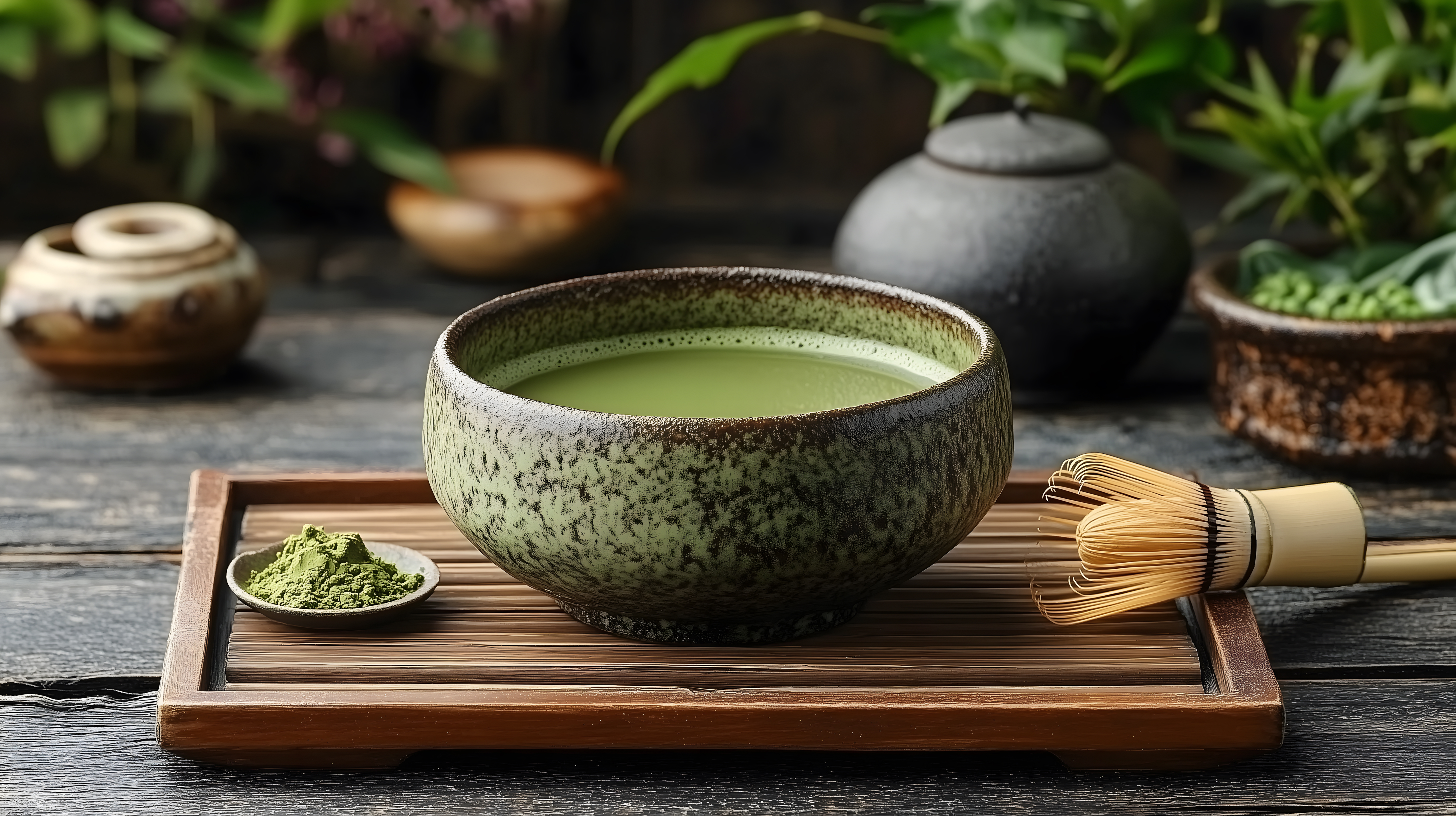 Dieses Foto zeigt eine traditionelle japanische Zubereitung von Matcha-Tee. In einer handgefertigten, grün-gesprenkelten Keramikschale befindet sich die leuchtend grüne, schaumige Matcha-Tee-Flüssigkeit. Ein Bambusbesen zum Aufschäumen des Tees liegt neben der Schale auf einem Holz-Tablett. Im Hintergrund sind weitere asiatische Tee-Utensilien zu sehen, die die Atmosphäre der traditionellen Teezeremonie unterstreichen. Dieses hochauflösende Stockfoto in hervorragender Qualität eignet sich hervorragend für Blog-Beiträge, Newsletter und Social-Media-Posts rund um das Thema gesunde Getränke, Wellness und asiatische Kultur. Es steht unter einer kostenlosen Creative-Commons-Lizenz zur Verfügung.