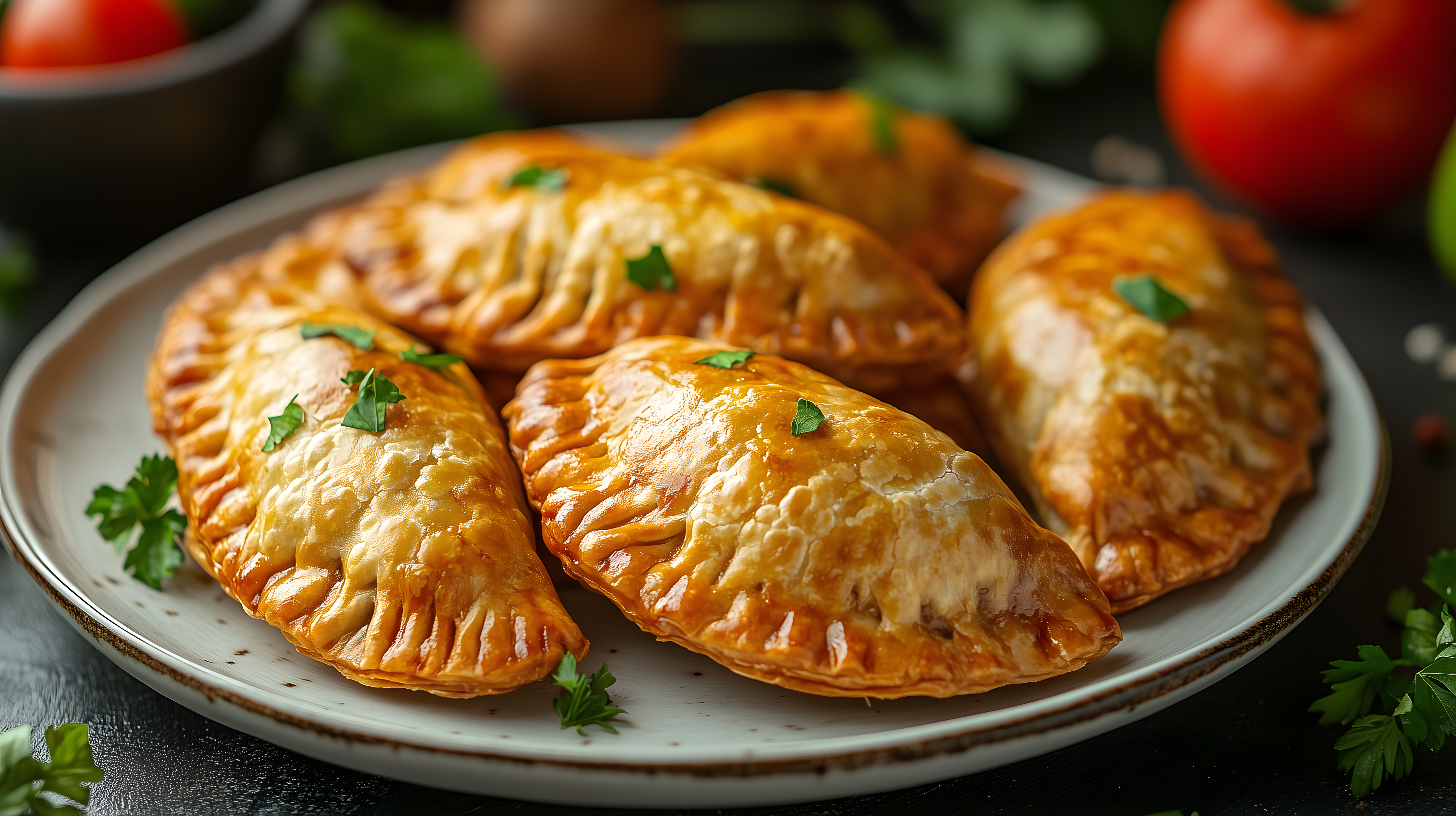 Dieses appetitliche Foto zeigt frisch gebackene gefüllte Empanadas auf einem Teller. Die goldbräunlichen Teigtaschen sind mit einer leckeren Rindfleischfüllung gefüllt und mit grüner Petersilie dekoriert. Die rustikale Optik und die knusprige Oberfläche machen das Gericht besonders einladend. Das Bild eignet sich hervorragend als kostenloses Stockfoto für Blogs, Social-Media-Beiträge, Newsletter oder Werbematerialien rund um das Thema Kochen, Essen und mexikanische Küche. Es ist in hoher Auflösung und unter der Creative-Commons-Lizenz verfügbar.