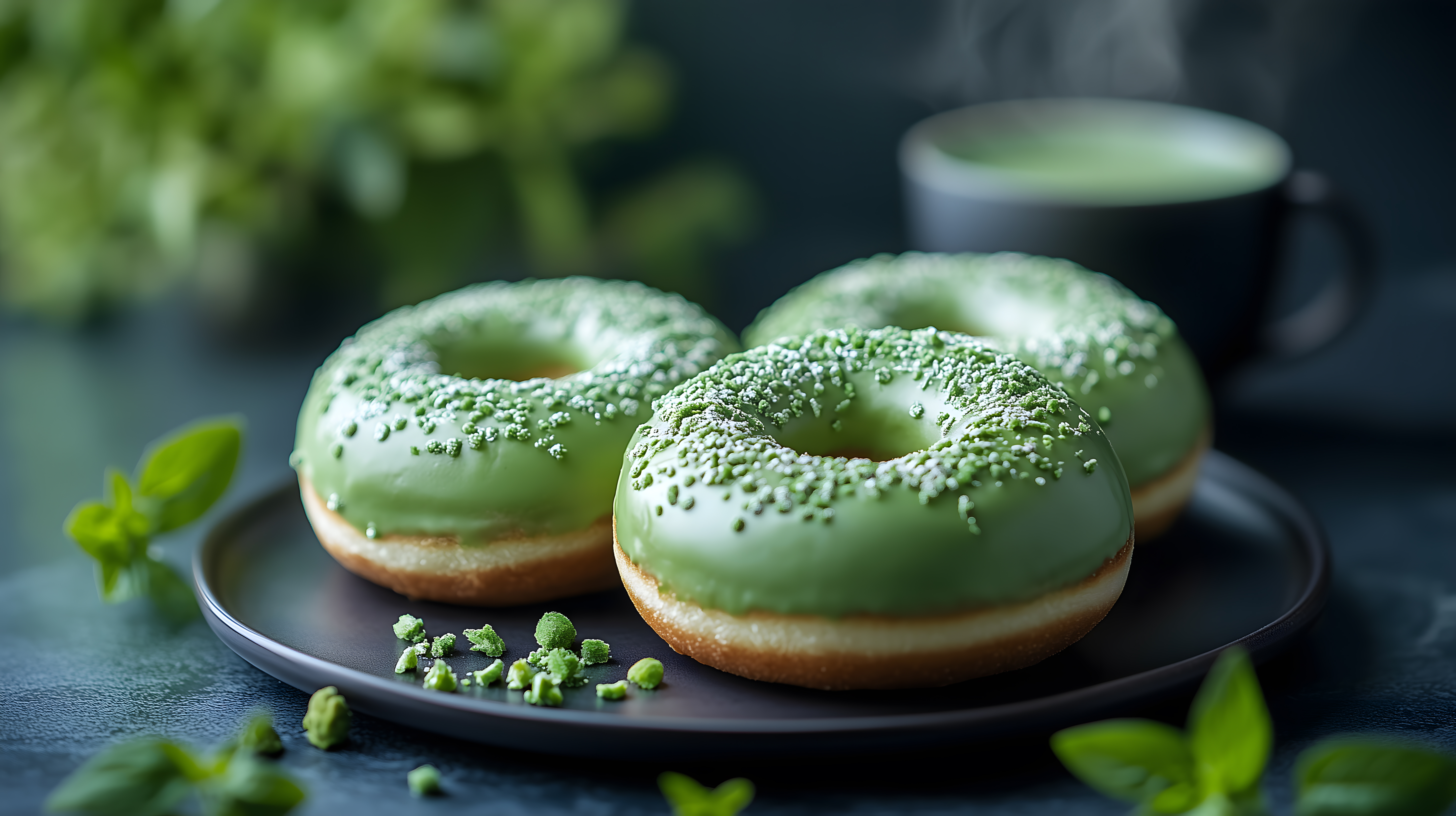Dieses appetitliche Foto zeigt zwei frische Matcha-Donuts mit einer eleganten, grünen Puderzucker-Glasur. Die Donuts sind auf einem dunklen Teller angerichtet und mit einigen zerkleinerten Matcha-Blättern als dekoratives Topping versehen. Der Kontrast zwischen dem saftigen Donut-Teig und der feinen, pudriger Glasur verleiht der Szene einen leckeren, frischen Gesamteindruck. Das Foto eignet sich hervorragend als stimmungsvolles Bild für kulinarische Blogs, Social-Media-Kanäle, Newsletter oder Werbematerialien rund um Backwaren, Snacks und Desserts. Das hochwertige Stockfoto ist in hoher Auflösung und unter einer Creative-Commons-Lizenz verfügbar.