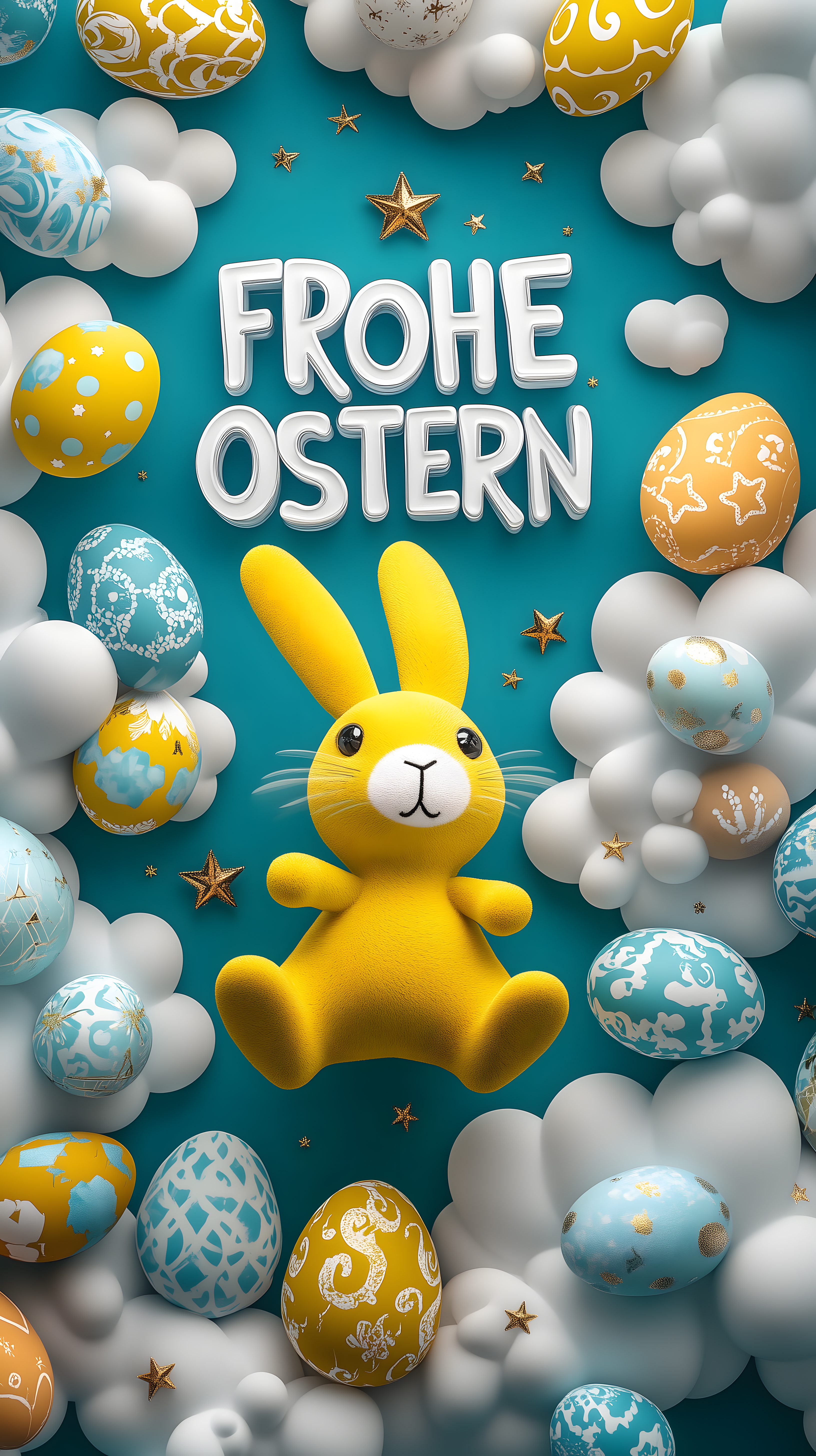 Dieses farbenfrohe und festliche Bild zeigt eine Komposition aus Ostereier in verschiedenen Farben und Mustern, darunter Türkis, Gelb und Weiß. Ein goldfarbener Plüschhase steht im Vordergrund, umgeben von Wolken und Sternen. Die ganze Szene ist in einem türkisfarbenen Hintergrund eingebettet, was dem Bild eine geheimnisvolle und magische Stimmung verleiht. Dieses kostenlose Stockfoto in hoher Auflösung eignet sich hervorragend für die Verwendung in Blogs, Newslettern, sozialen Medien oder Werbematerial rund um das Osterfest. Es steht unter der Creative-Commons-Lizenz zur Verfügung.