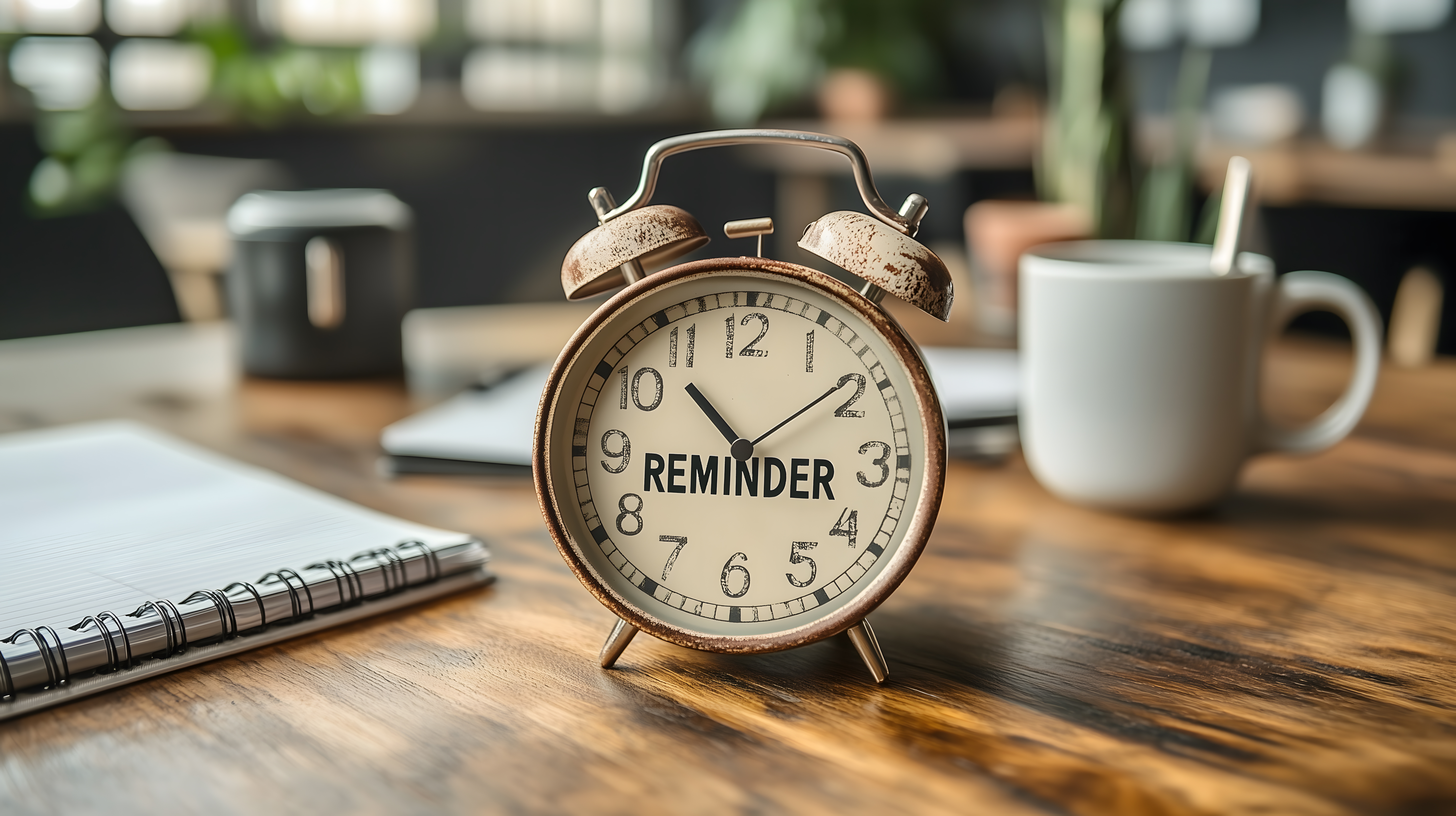 Das Bild zeigt einen nostalgischen Wecker mit der Aufschrift 'REMINDER' auf einem hölzernen Bürotisch. Neben dem Wecker befinden sich eine weiße Tasse und ein Notizblock. Die Komposition vermittelt eine ruhige, konzentrierte Arbeitsatmosphäre. Die Farbgebung in Braun- und Beige-Tönen verleiht dem Foto einen zeitlosen, vintage-artigen Charakter.